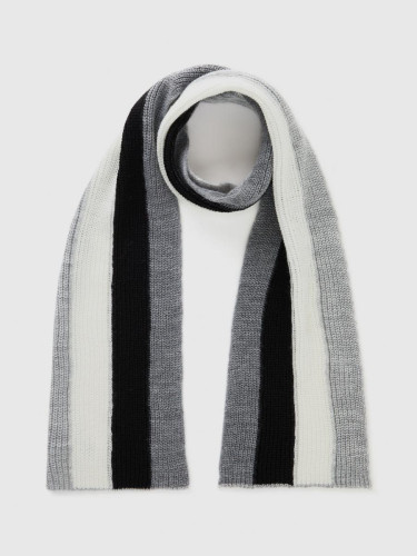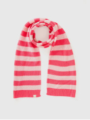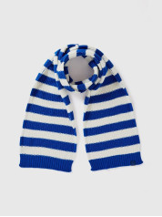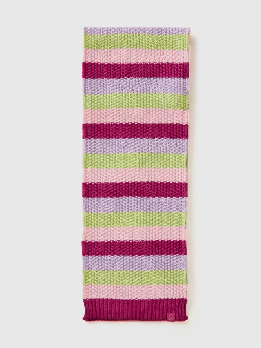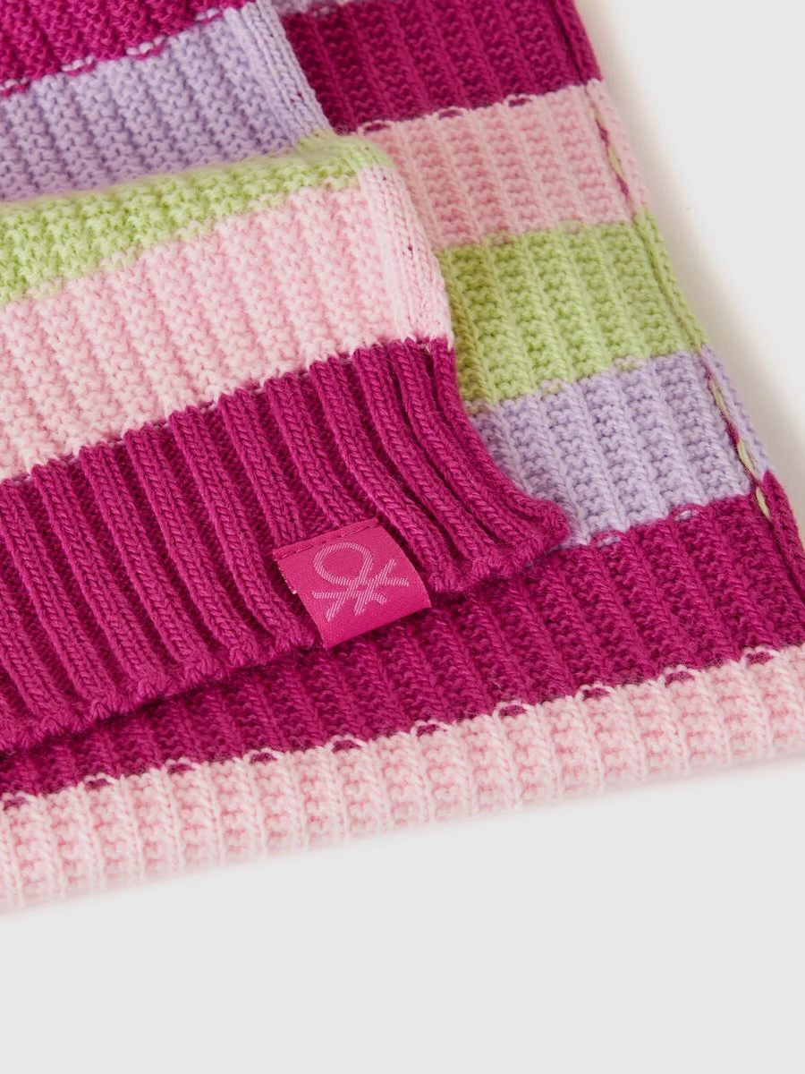 Benetton dečiji višebojni prugasti šal sa logom na jednom kraju. Specijalno pletivo sa karakteristikama uboda. Ovaj proizvod je napravljen na održiv način zahvaljujući projektu VASATEKS, koji omogućava da se voda iz proizvodnog ciklusa povrati i ponovo koristi u narednim procesima.