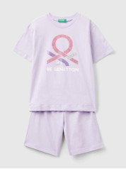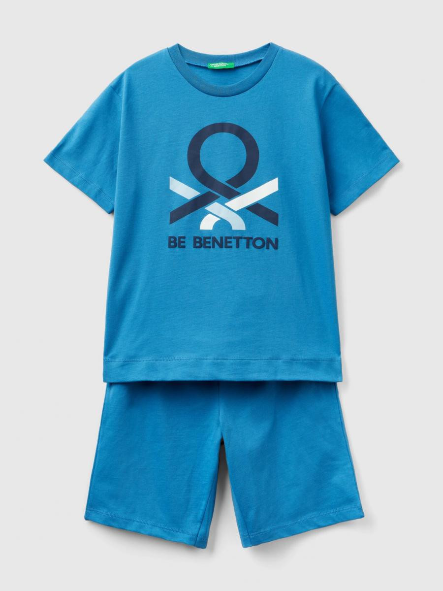 Benetton dečija pidžama od mekog čistog pamuka. Gornji deo sa okruglim izrezom kratkih rukava sa spuštenim ramenima. Velika višebojna štampa logotipa na prednjoj strani. Kratke pantalone sa unutrašnjom elastičnom trakom u struku.
