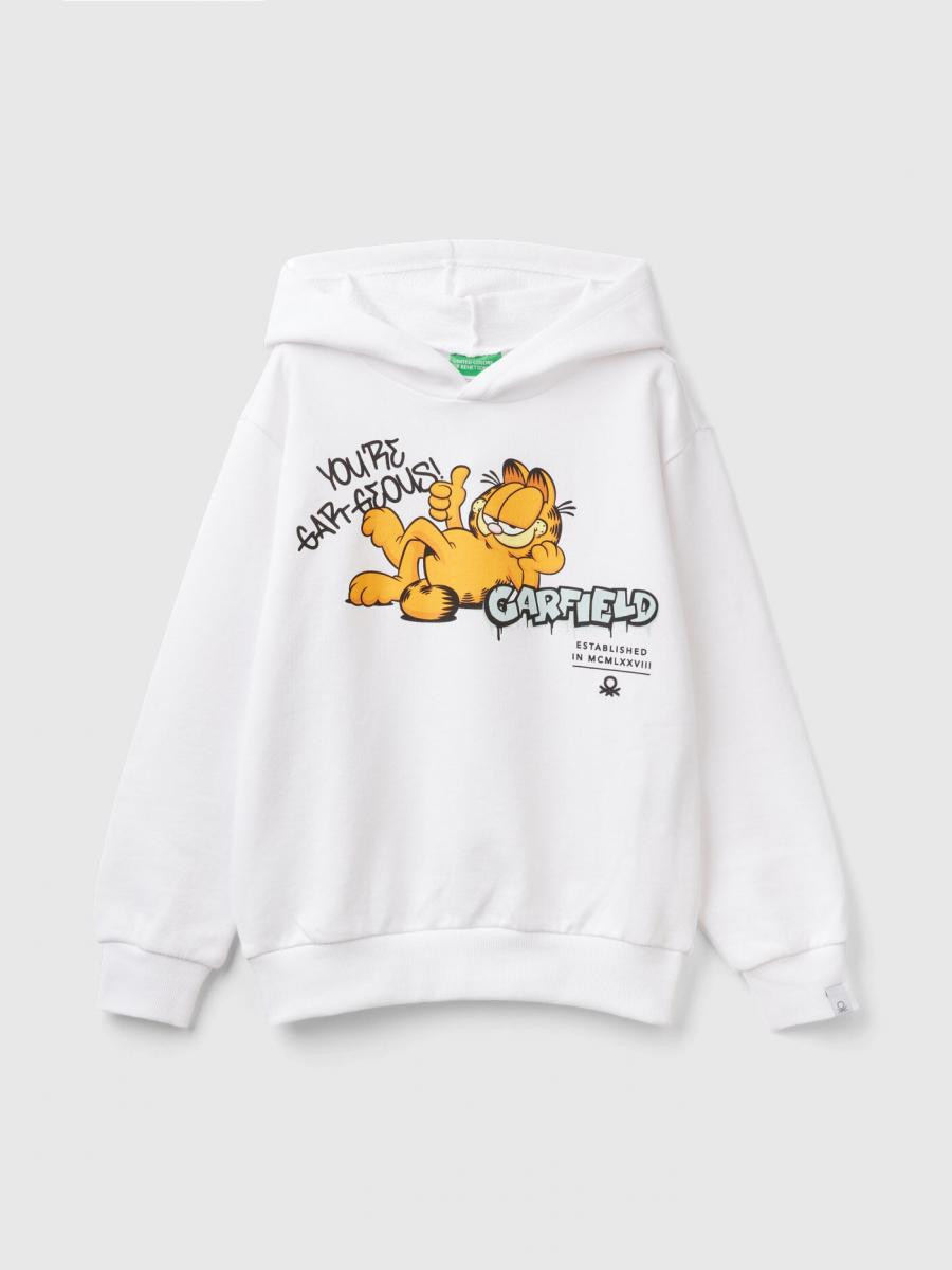 Benetton dukserica za dečaka sa kapuljačom od čistog pamuka sa postojanim, ali laganim osećajem. Opuštenog kroja sa dugim rukavima i spuštenim ramenima. Garfield print od Pavs, Inc. na prednjoj strani. Za izgled inspirisan stripovima iz 70-ih.