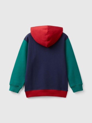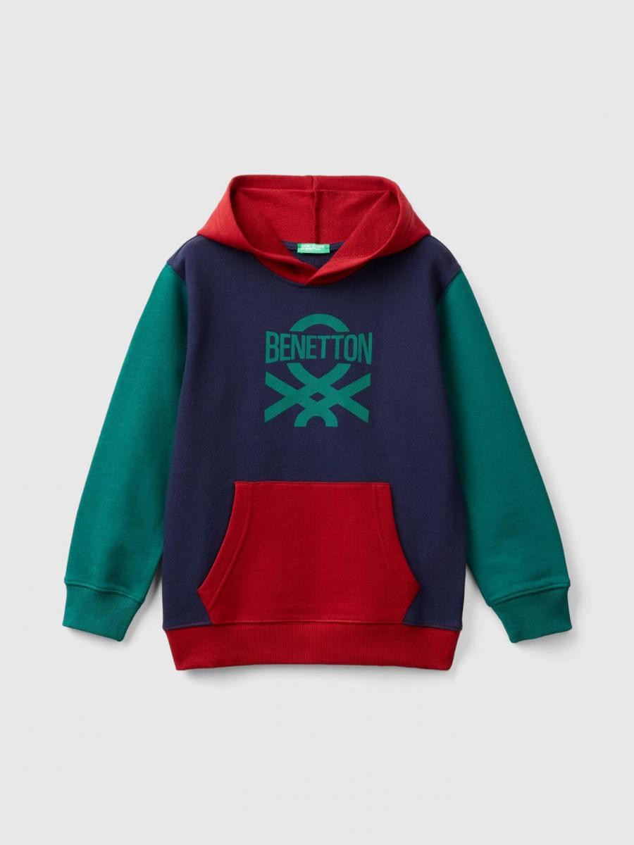 Benetton dukserica dugih rukava za dečaka od čistog pamuka sa čvrstim, ali laganim osećajem. Sportskog stila, sa prednjim kengur džepom i štampom logotipa na prednjoj strani.