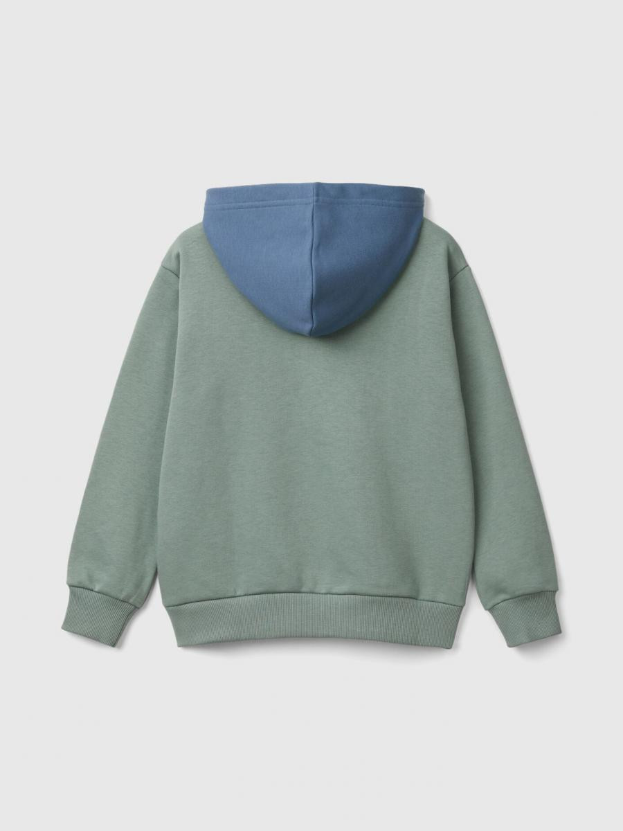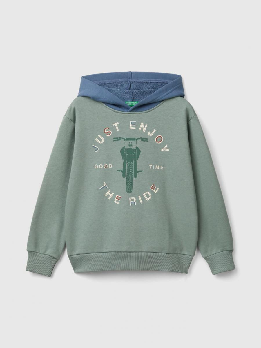 Benetton dukserica dugih rukava za dečaka od meke mešavine pamuka. Sa kapuljačom i štampom na prednjoj strani.