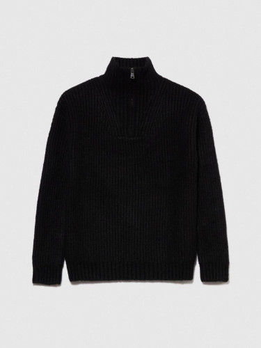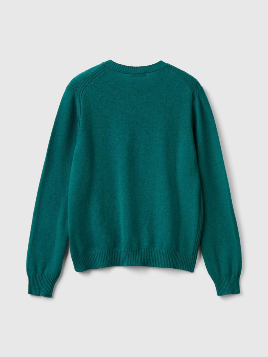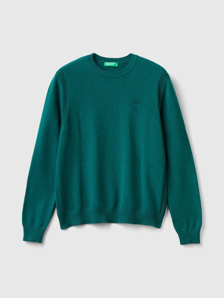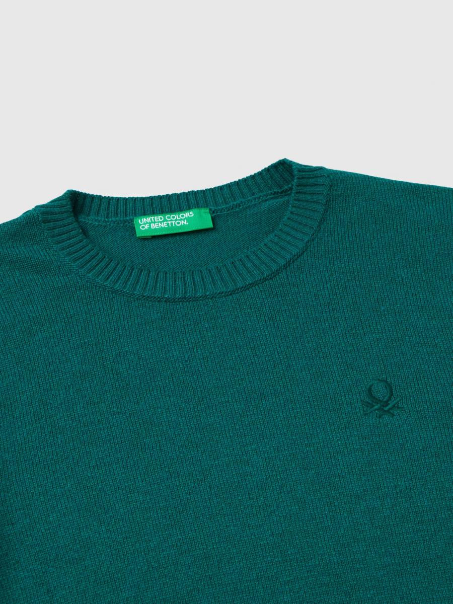 Benetton mekani džemper za dečaka sa okruglim izrezom dugih rukava od mešavine reciklirane vune, viskoze i kašmira. Regular fit model i vezeni logo na levoj strani grudi. Topao i udoban.