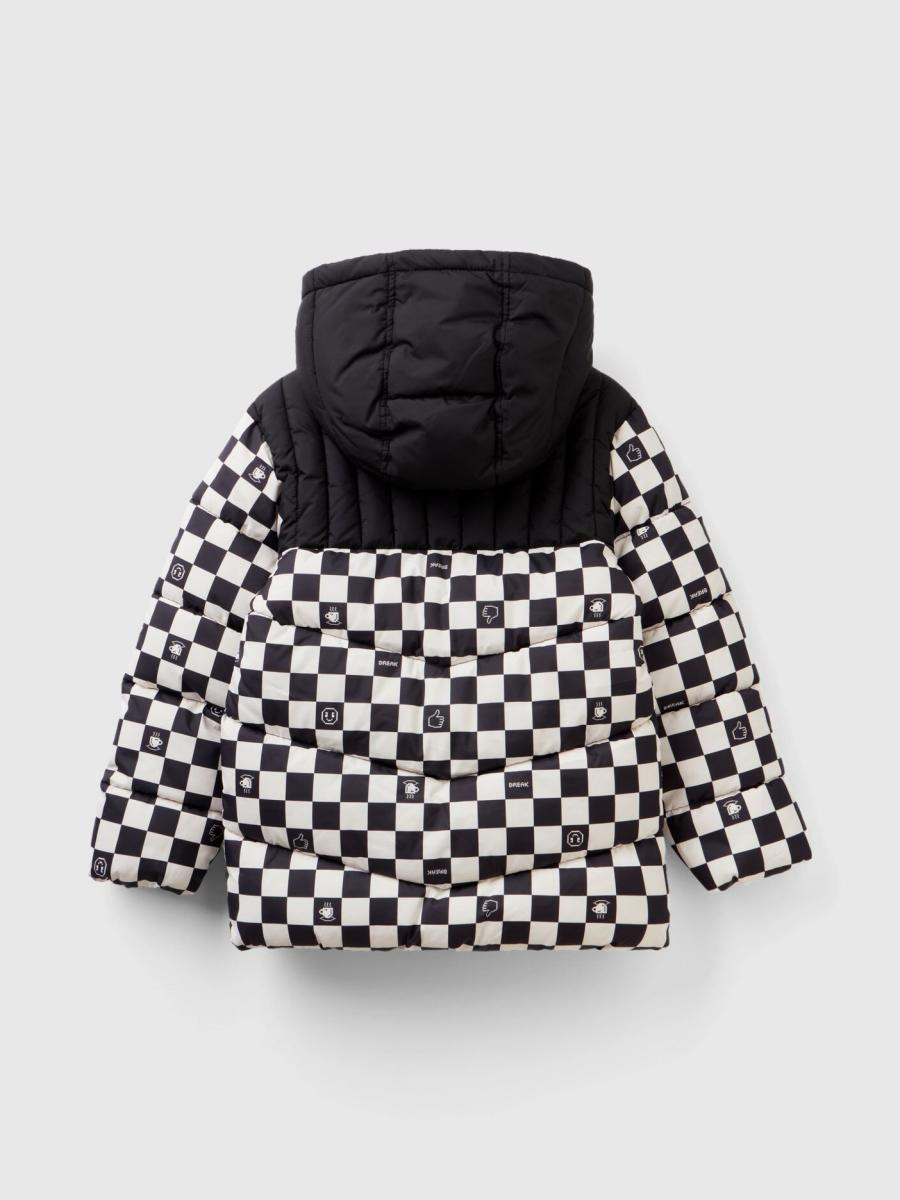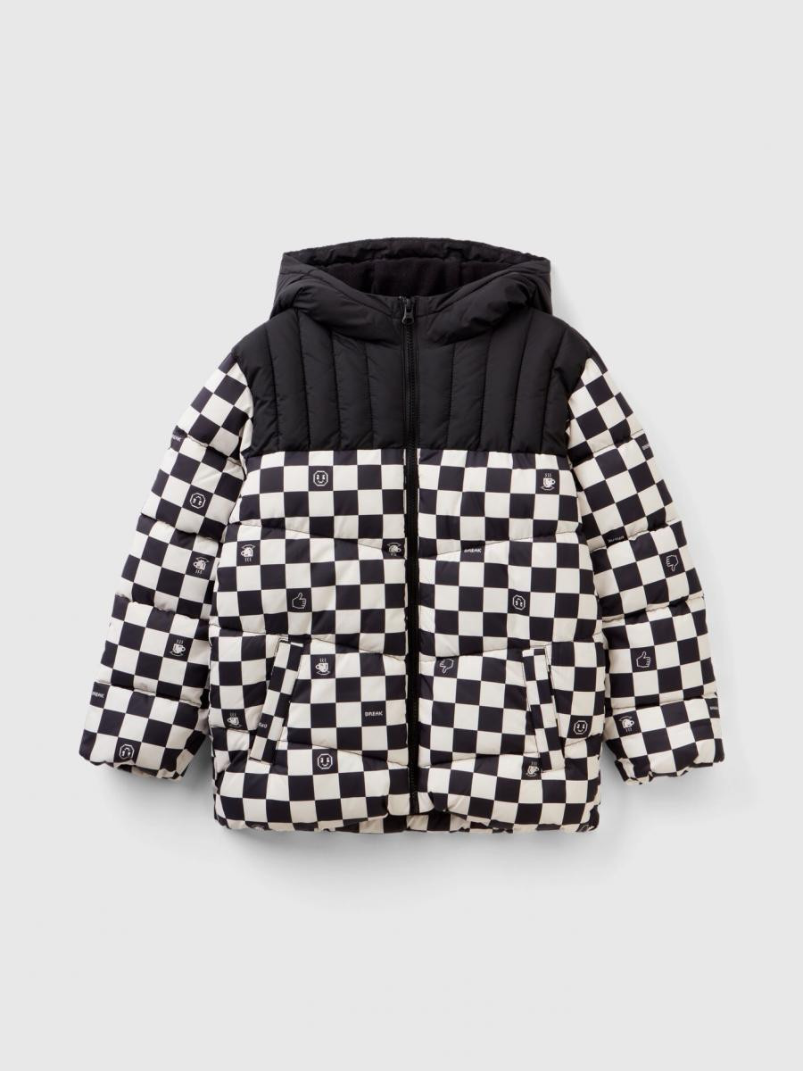 Benetton podstavljena jakna za dečaka od tehničke tkanine Rain Defender, topla, ali ultra lagana, sa podstavom Duck Free. Kapuljača i jaram jednobojni, crno-beli karirani dezen na ostatku komada. Podstavljena kapuljača od mekanog flisa, kopčanje na patentni zatvarač i praktični prednji džepovi.