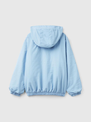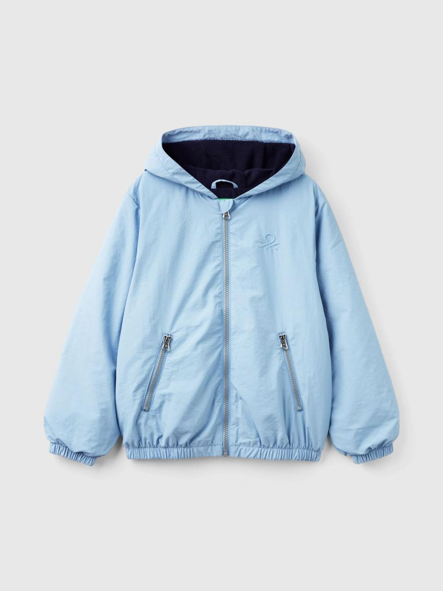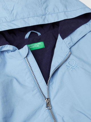 Benetton jakna sa kapuljačom za dečaka od najlona Rain Defender, podstavljena mekim flisom. Opremljena prednjim kopčanjem sa patent zatvaračem i sigurnosnim patentnim zatvaračem, prednjim džepovima, izvezenim logom na levoj strani grudi, unutrašnjom elastičnom trakom na krajevima i manžetnama. Idealna za prelazni period i kišne dane.