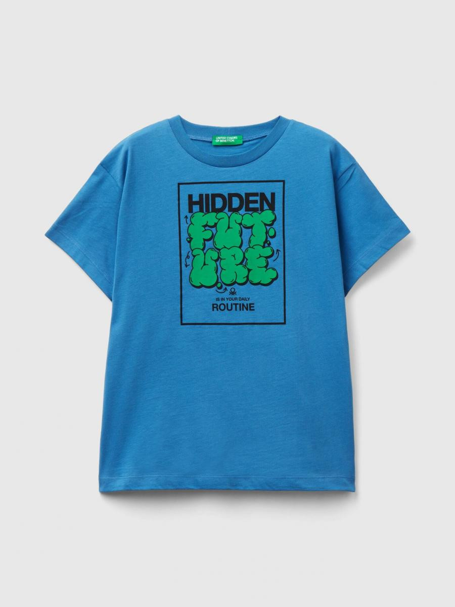 Benetton majica za dečaka sa okruglim izrezom kratkih rukava od čistog organskog pamuka sa štampom slogana na prednjoj strani. Osnovna i svakodnevna, savršena uz par bermuda.