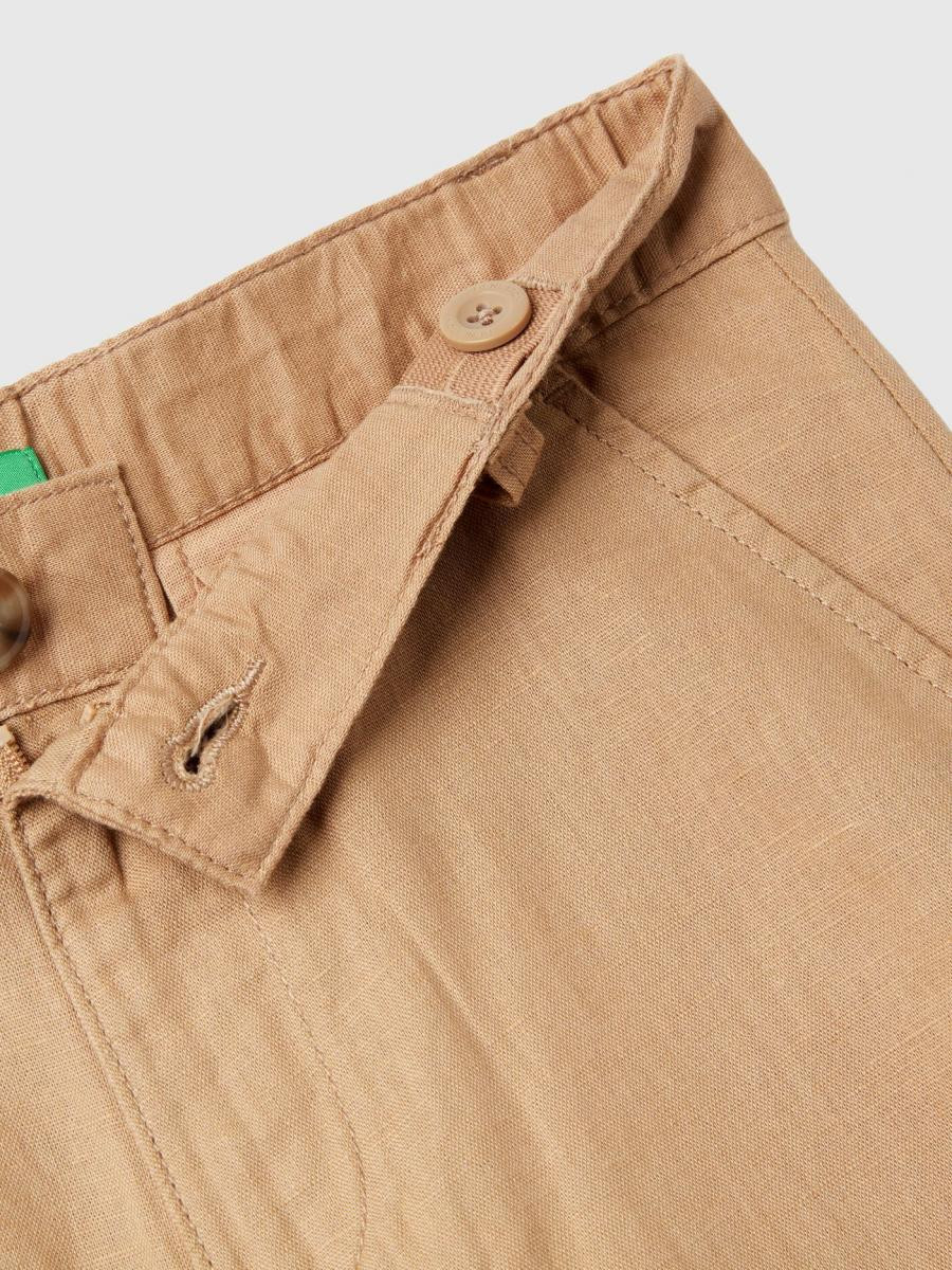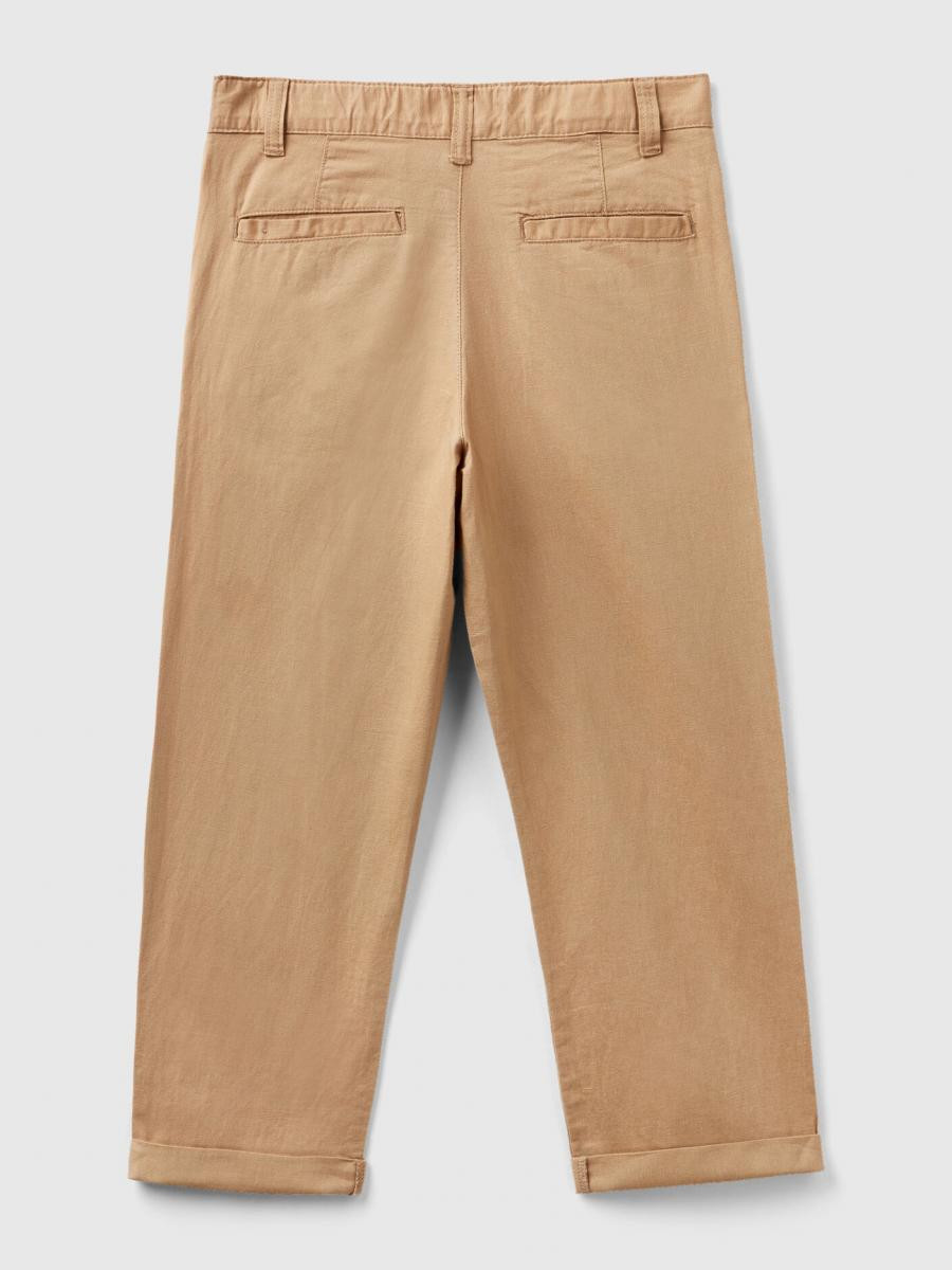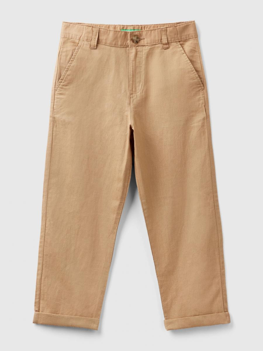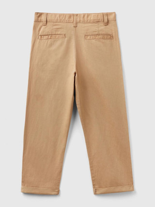 Benetton pantalone za dečaka od mešavine lana i pamuka opuštenog kroja. Običan struk sa patentnim zatvaračem i otvaranjem na dugme, podesivi unutrašnji elastični struk. Dijagonalni džepovi na prednjoj strani i džepovi sa rubom na leđima.
