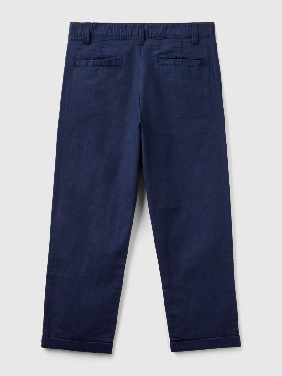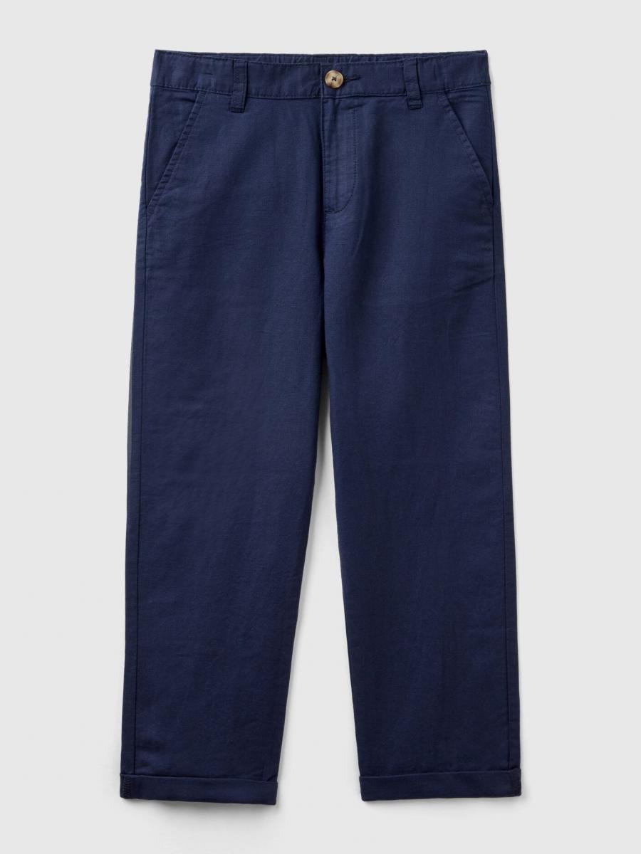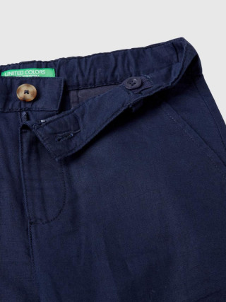 Benetton pantalone za dečaka od mešavine lana i pamuka opuštenog kroja. Običan struk sa patentnim zatvaračem i otvaranjem na dugme, podesivi unutrašnji elastični struk. Dijagonalni džepovi na prednjoj strani i džepovi sa rubom na leđima.