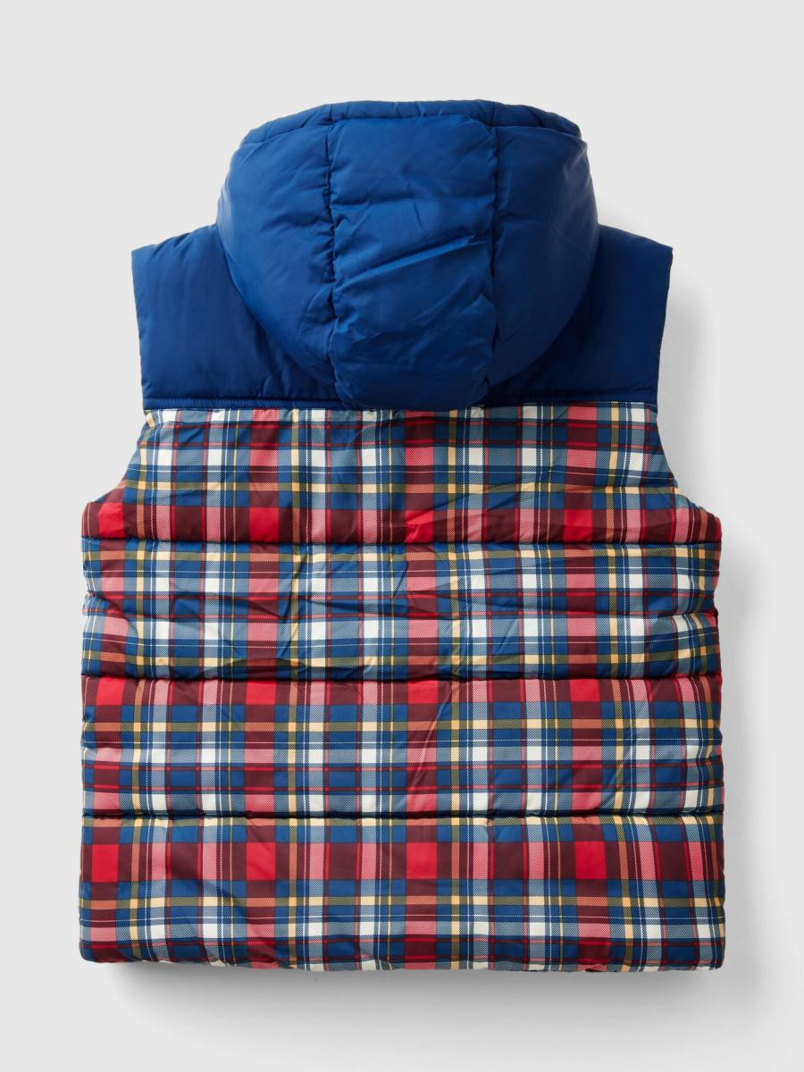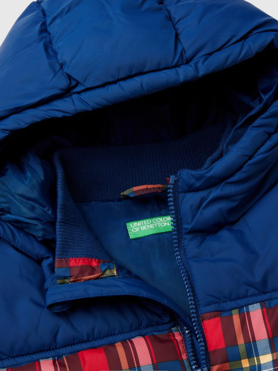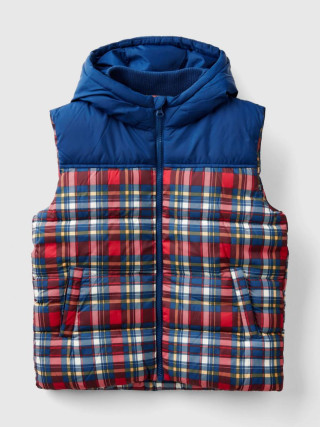 Benetton prsluk za decaka od najlona sa horizontalnim prošivom. Opremljen prakticnom kapuljacom, otvorom na patent zatvarac i umetnutim džepovima na prednjoj strani.