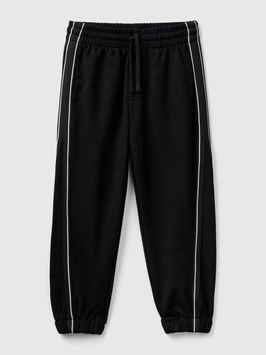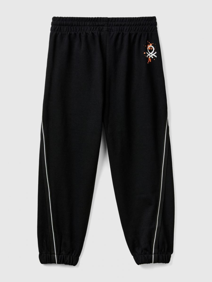 Benetton donji deo trenerke za dečaka od mešavine rastegljivog pamuka. Struk sa unutrašnjom elastičnom trakom i vezicom, džepovi umetnuti sa strane. Sa strane našivena traka, unutrašnja elastična traka na dnu nogavice, logo odštampan na leđima. Savršen za trčanje i igru.