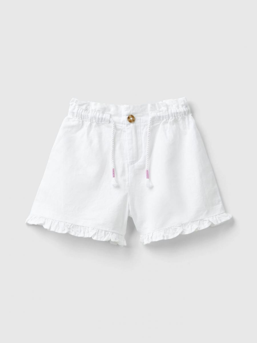 Benetton šorts za devojčicu sa skupljenim strukom, vezicom nalik užetu i nežnim naborima na dnu nogavica. Ovaj komad je napravljen od mešavine pamuka i lana: otpornih biljnih vlakana koje se mogu reciklirati i koje troše minimalne prirodne resurse.