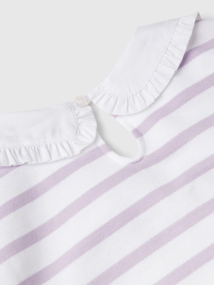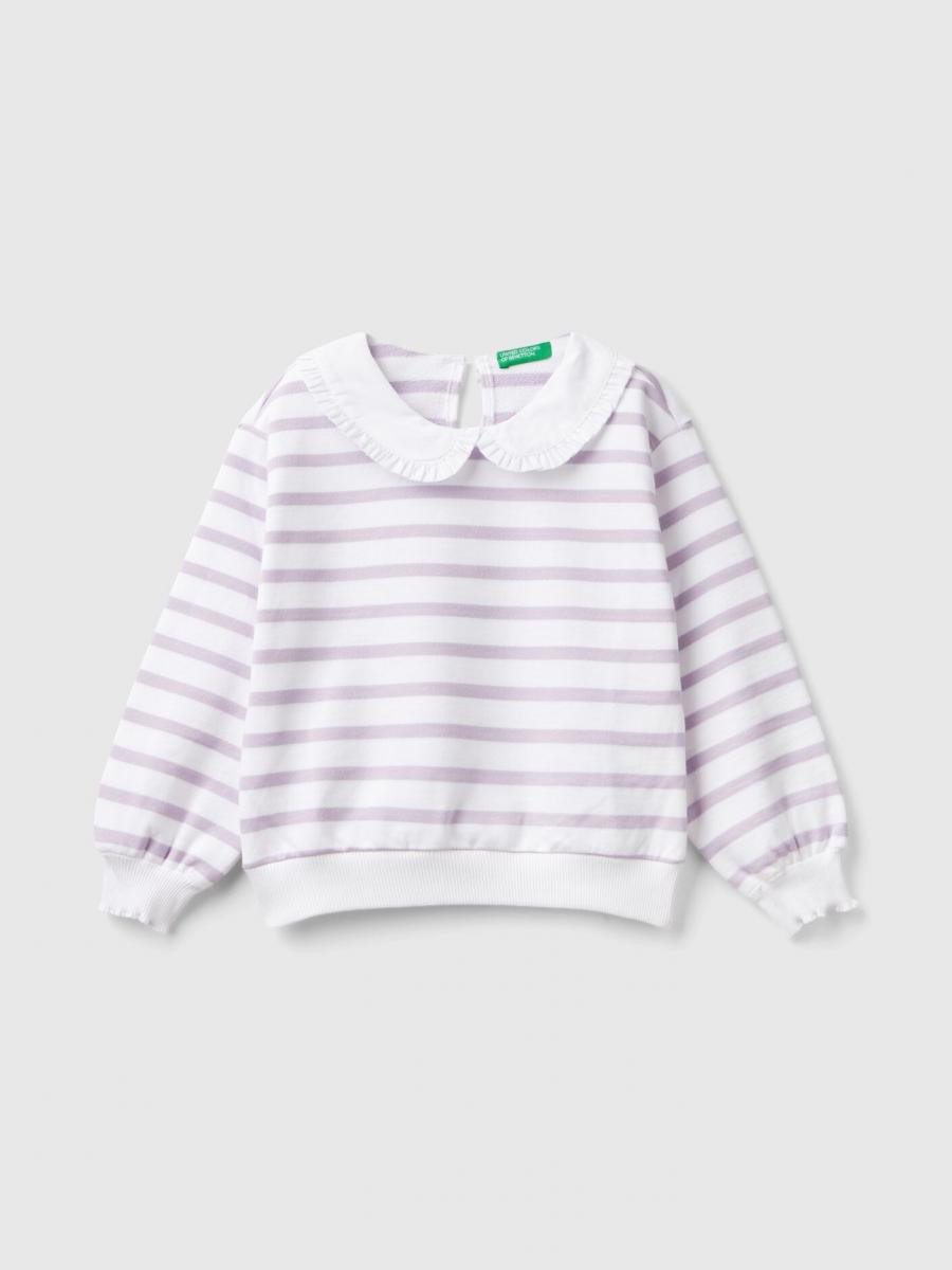 Benetton dukserica dugih rukava od čistog pamuka sa prugama obojenim predivom. Lepa kragna sa zaobljenim vrhovima i volanima. Malo opušteni kroj, kapljičasti otvor sa dugmetom na leđima. Šik komad za njihove svakodnevne kombinacije.