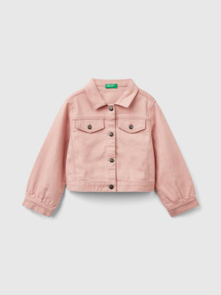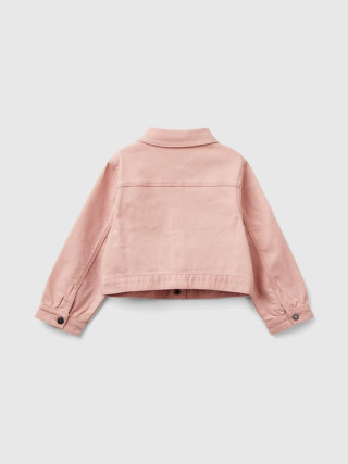 Benetton jakna za devojčicu od rastegljivog pamučnog platna skraćenog, opuštenog kroja. Kragna košulje, prednje kopčanje sa dugmićima, džepovi sa preklopom na grudima. Vesela i ženstvena, savršena za srednju sezonu.