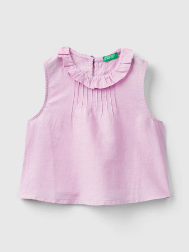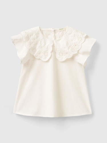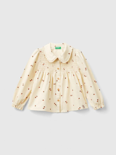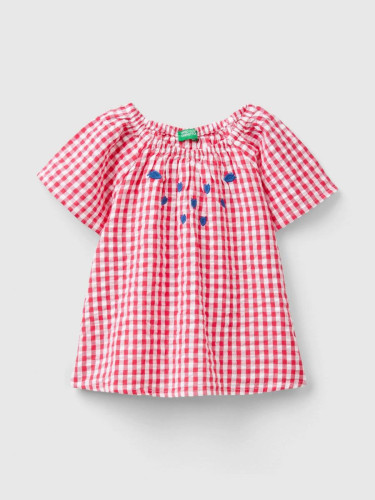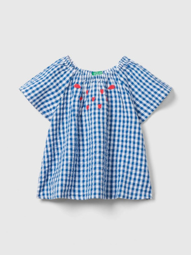 Benetton lepršava bluza za devojčicu od čistog pamuka sa šarenom kariranom šarom. Elastični okrugli izrez, kratki raglan rukavi i voćni vez na grudima. Odeća inspirisana letom.