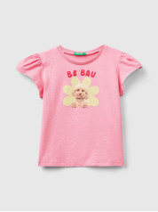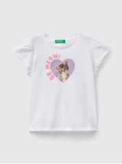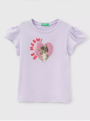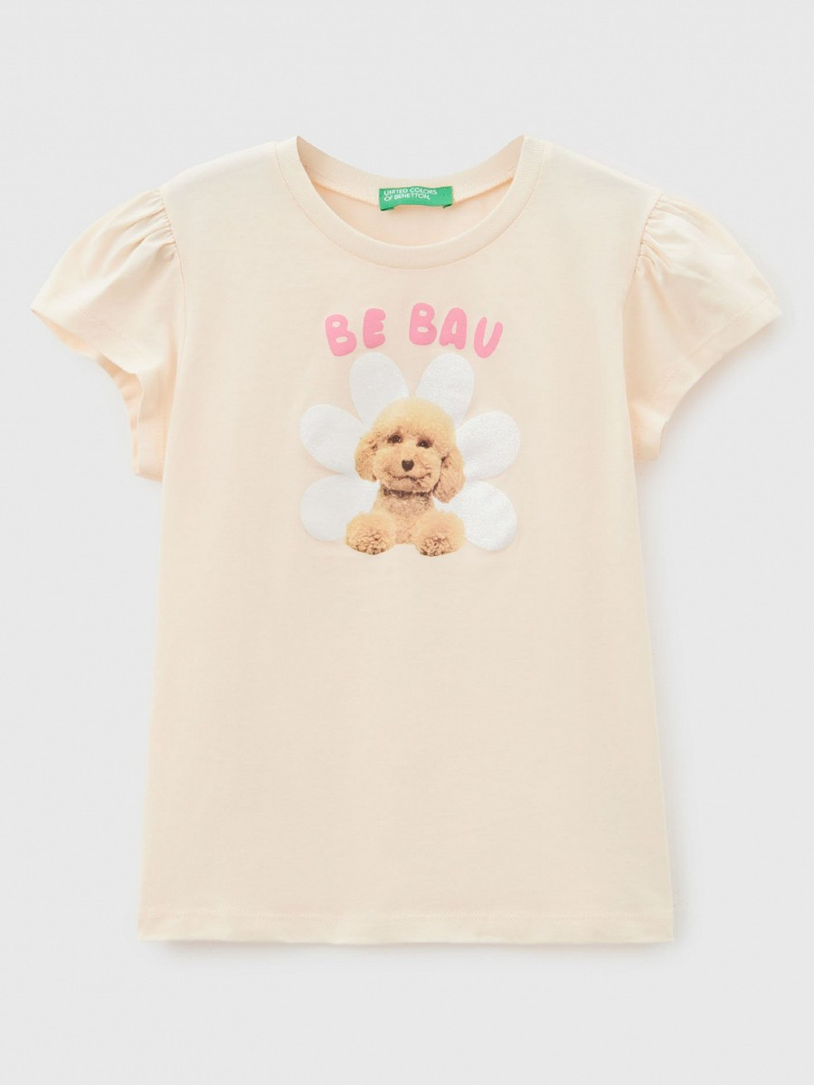 Benetton majica za devojčicu sa okruglim izrezom od čistog organskog pamuka. Kratki rukavi sa blagim naborima na ramenu. Štampa fotografije sa svetlucavim detaljima na prednjoj strani. Blago raširenog kroja, za blistavu, svakodnevnu odeću.