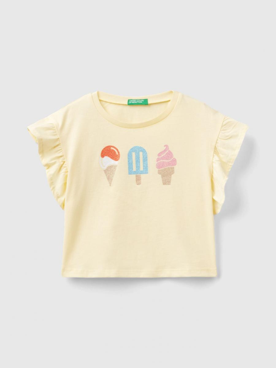 Benetton majica za devojčicu sa okruglim izrezom od čistog organskog pamuka. Opuštenog kroja sa kratkim leptir rukavima i svetlucavom štampom na prednjoj strani. Savršena da ulepša svaki letni dan.