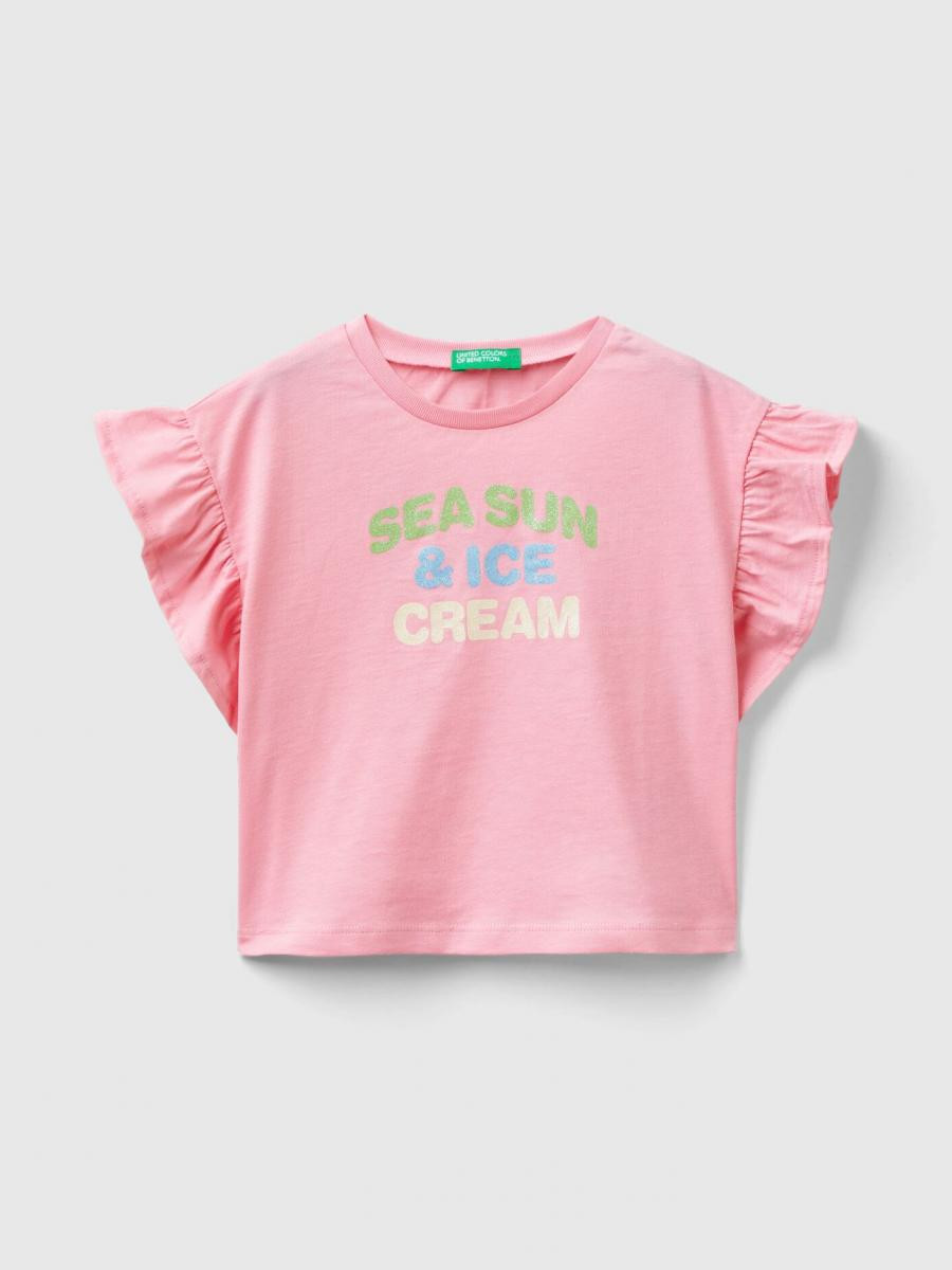 Benetton majica za devojčicu sa okruglim izrezom od čistog organskog pamuka. Opuštenog kroja sa kratkim leptir rukavima i svetlucavom štampom na prednjoj strani. Savršena da ulepša svaki letni dan.