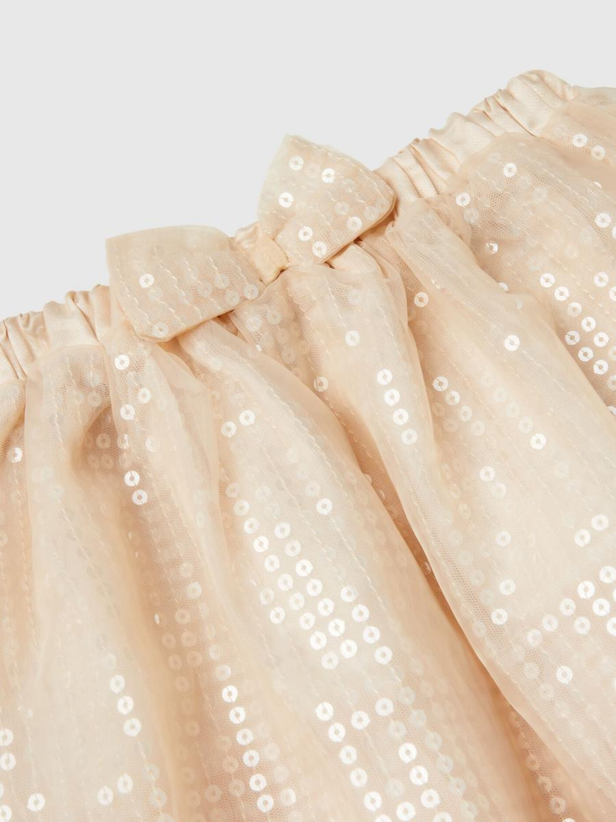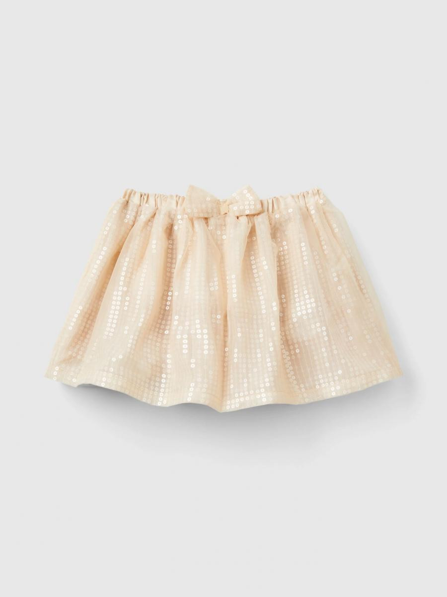 Benetton suknja za devojčicu sa postavom od mekog tila presvučena šljokicama. Struk sa elastičnom trakom i mašnom na prednjoj strani.