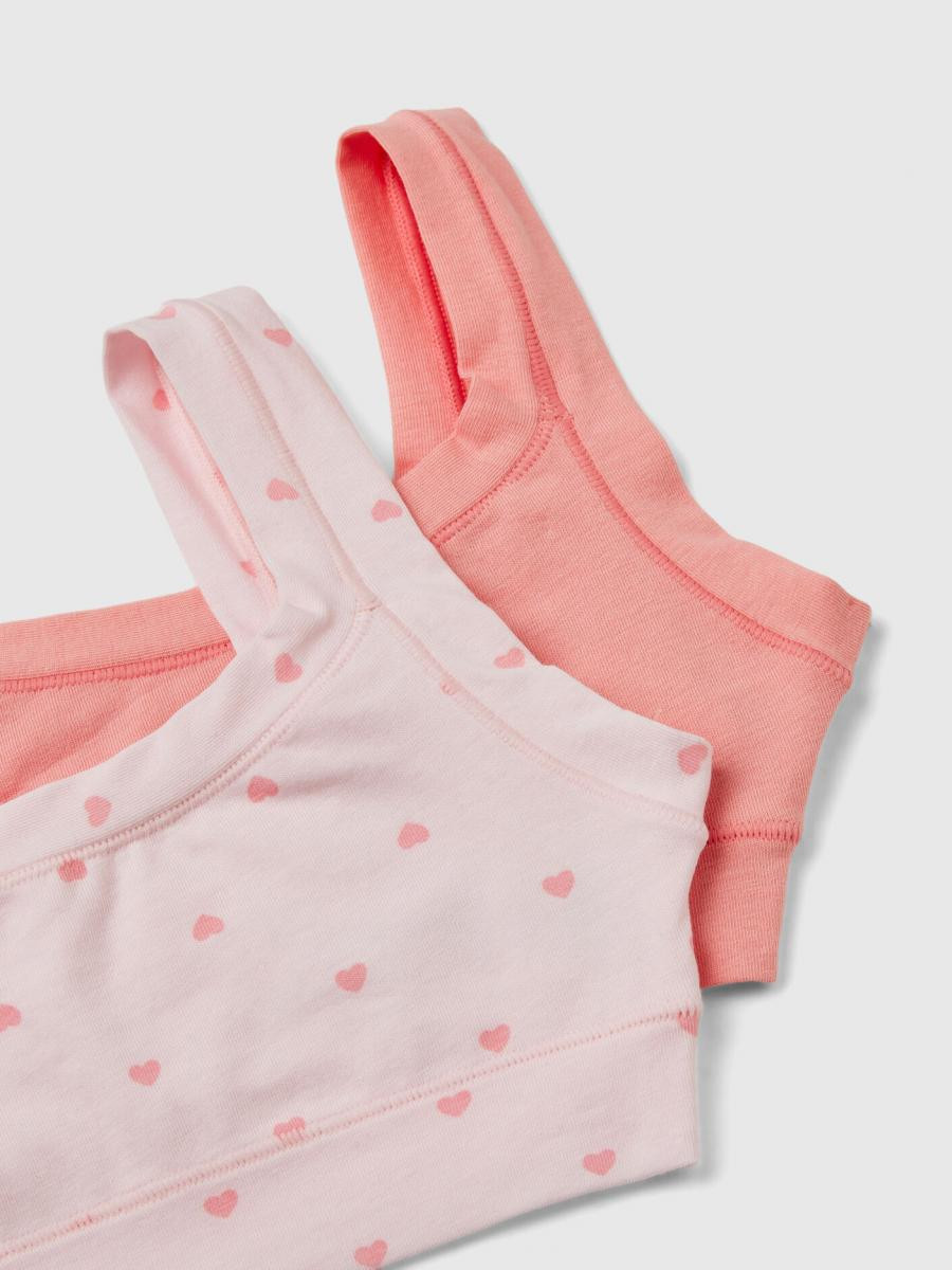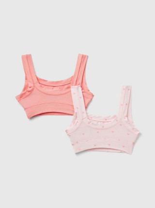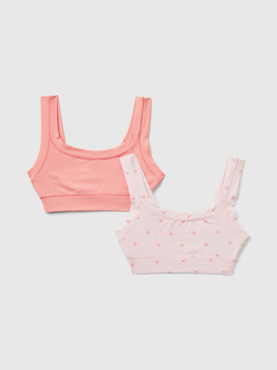 Benetton set od dva grudnjaka za devojčicu od super rastegljive mešavine organskog pamuka. Jedan je jednobojan, drugi sa šarenom štampom. Maksimalno prianjanje za ultra udobnu odeću.