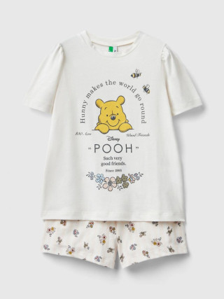 Benetton pidžama za devojčicu od mešavine toplog pamuka i viskoze. Majica kratkih rukava sa okruglim izrezom sa printom Disnei Vinnie the Pooh sa svetlucavim detaljima na prednjoj strani. Šorts sa praktičnim unutrašnjim elastičnim strukom i prugastim dezenom.