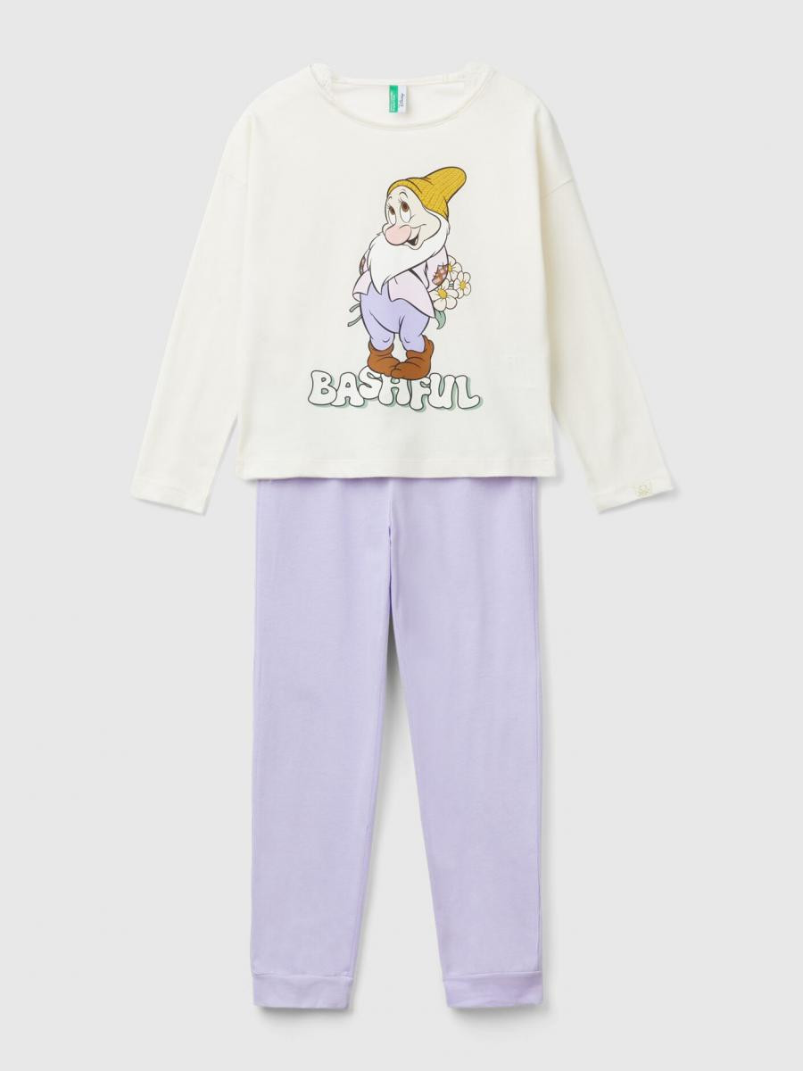 Benetton pidžama za devojčicu tople teksture. Majica dugih rukava sa čipkastim umetkom na vratu i šljokicama Disnei Bashful print na prednjoj strani. Duge pantalone sa prekrivenim elastičnim strukom. Napravljen od čistog pamuka dugih vlakana, poznatog materijala koji nudi otpornost, mekoću i udobnost.