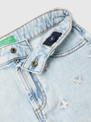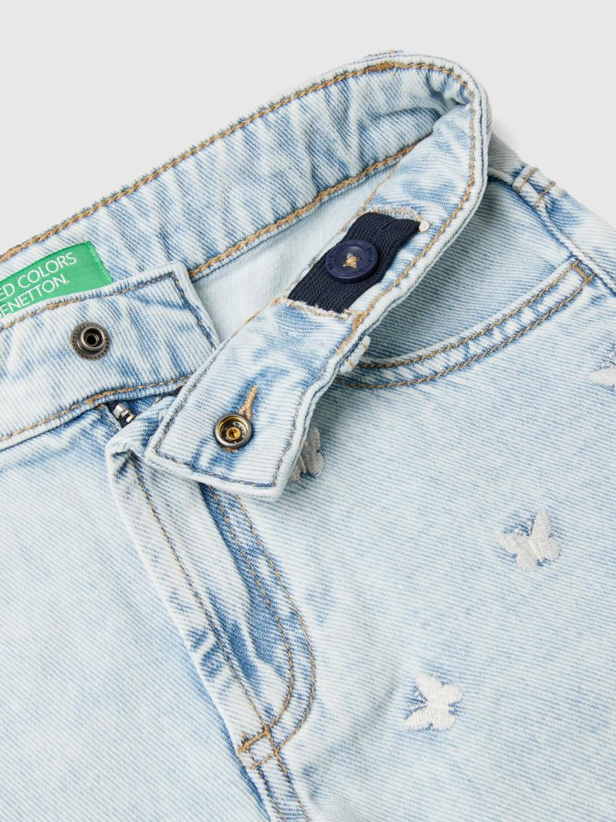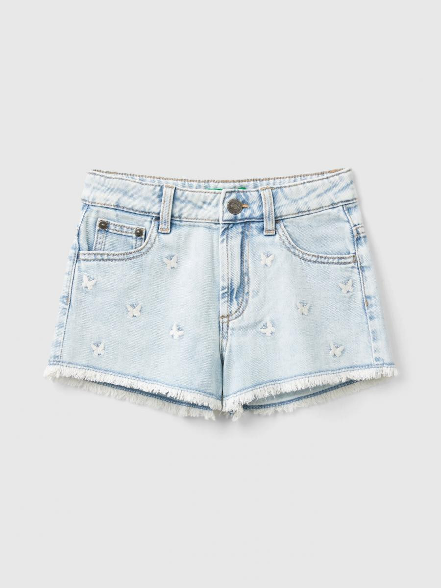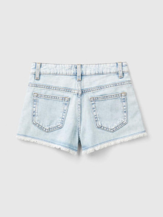 Benetton šorts za devojčicu od pamuka i liocel mešavine teksasa sa posebnim laganim izbeljenim tretmanom sa istrošenim izgledom. Kopčanje patent zatvarača i dugmetom, podesivi unutrašnji elastični struk. Dizajn sa pet džepova sa resama na dnu i vezenim leptirima na prednjoj strani. Ležeran klasik sa romantičnim ukusom.