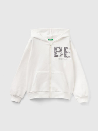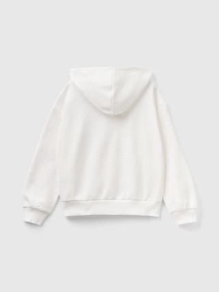 Benetton dukserica dugih rukava za devojčicu od mekane mešavine pamuka normalnog kroja. Opremljen kapuljačom, prednjim džepovima i spuštenim ramenima. Grafika sa štampom i vezenim šljokicama za zadivljujuc´i izgled.