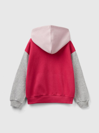 Benetton dukserica dugih rukava za devojčicu od mekane mešavine pamuka normalnog kroja. Opremljen kapuljačom, prednjim džepovima i spuštenim ramenima. Grafika sa štampom i vezenim šljokicama za zadivljujuc´i izgled.