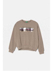 Benetton dukserica dugih rukava za devojčicu sa okruglim izrezom od čistog pamuka sa postojanim, ali laganim osećajem. Spuštena ramena, pravilnog kroja, štampe sa šljokicama i grafike na prednjoj strani. Udoban i blistav, za moderan izgled.