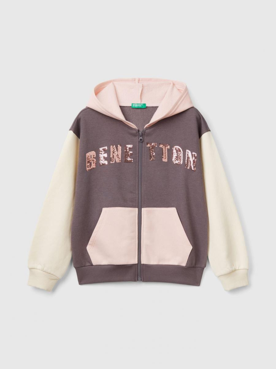 Benetton dukserica dugih rukava za devojcicu od meke mešavine pamuka sa toplim osecajem. Regular fit kroj, malo kratak. Sa kapuljacom, prednjim džepovima i grafikom sa štampanim i vezenim šljokicama.