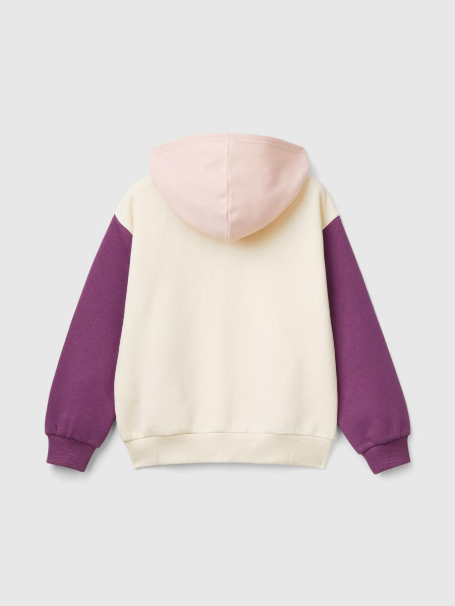 Benetton dukserica dugih rukava za devojcicu od meke mešavine pamuka sa toplim osecajem. Regular fit kroj, malo kratak. Sa kapuljacom, prednjim džepovima i grafikom sa štampanim i vezenim šljokicama.