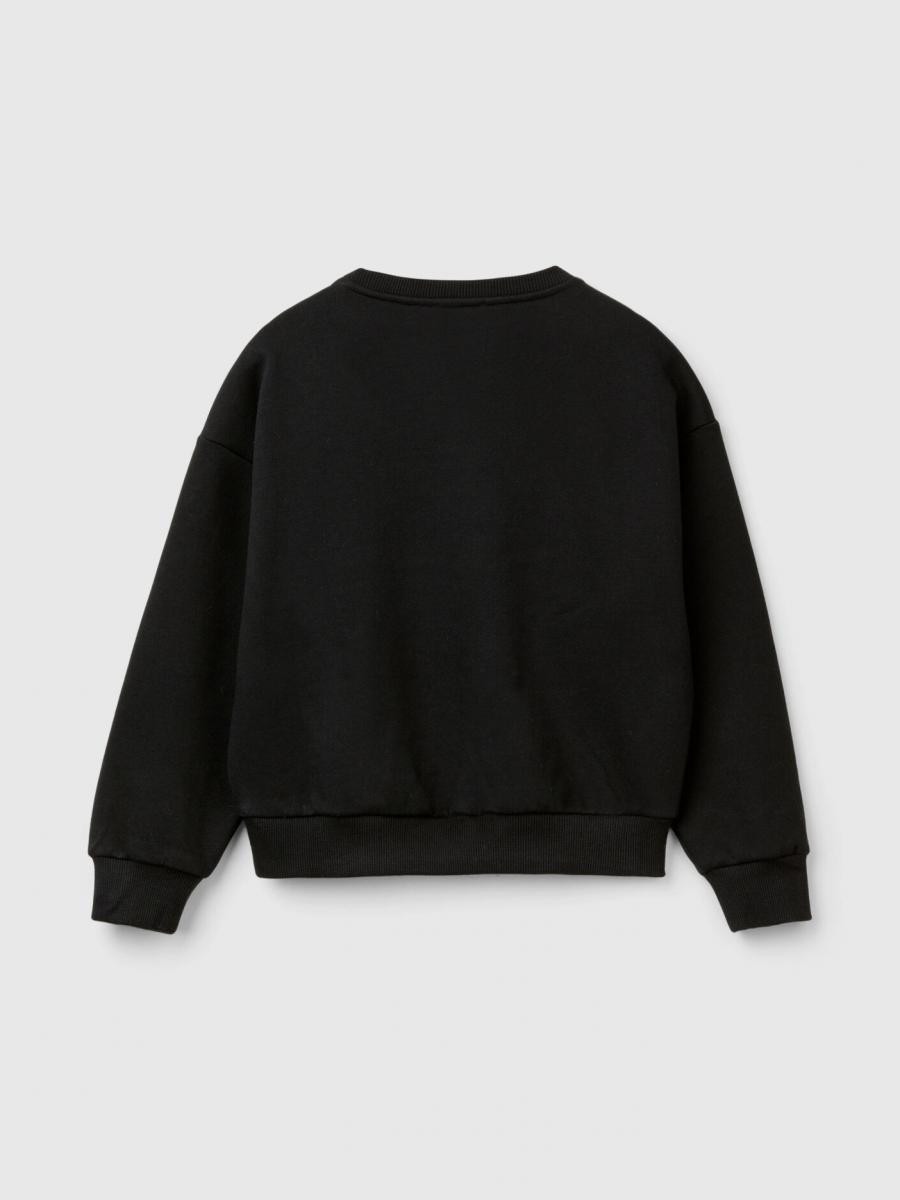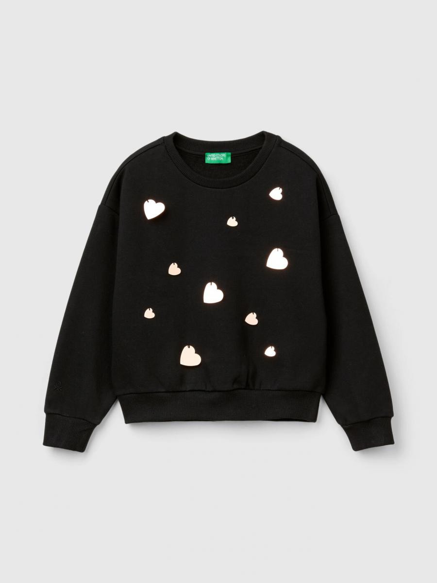 Benetton dukserica dugih rukava za devojčicu sa velikim izrezom od toplog pamuka. Malo opuštenog kroja i šljokice u obliku srca nanešene na poprsje.