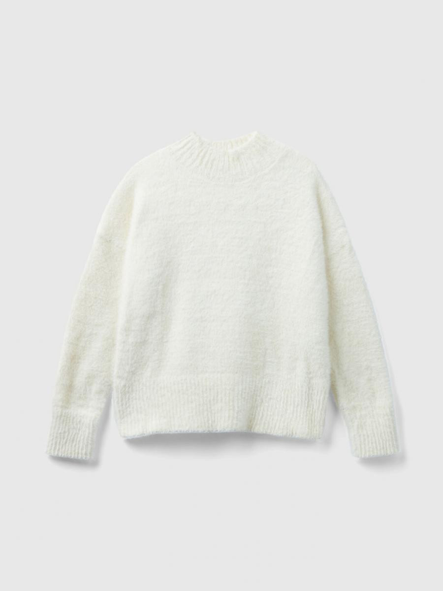 Benetton mekani džemper za devojčicu od mekog krznenog prediva, sa visokim vratom, dugim rukavima i spuštenim ramenima. Toplo i udobno, alternativa klasičnom džemperu.