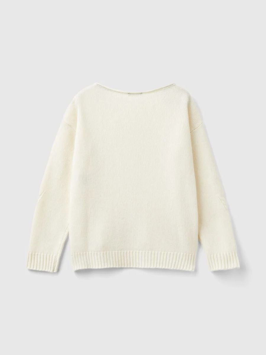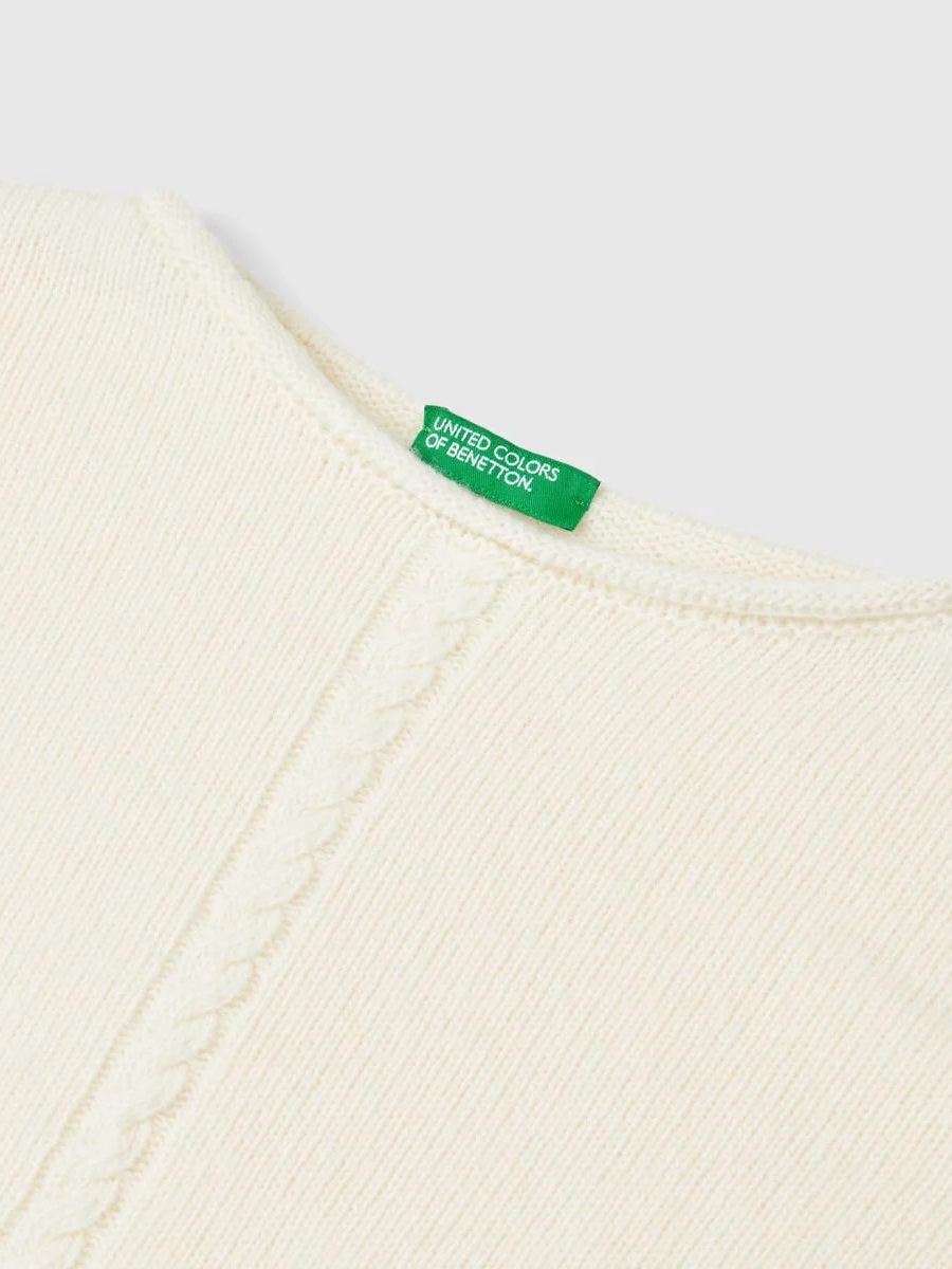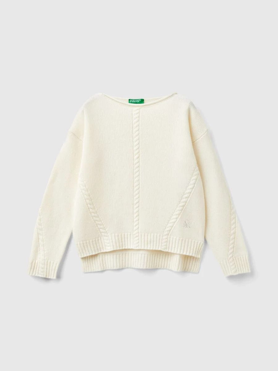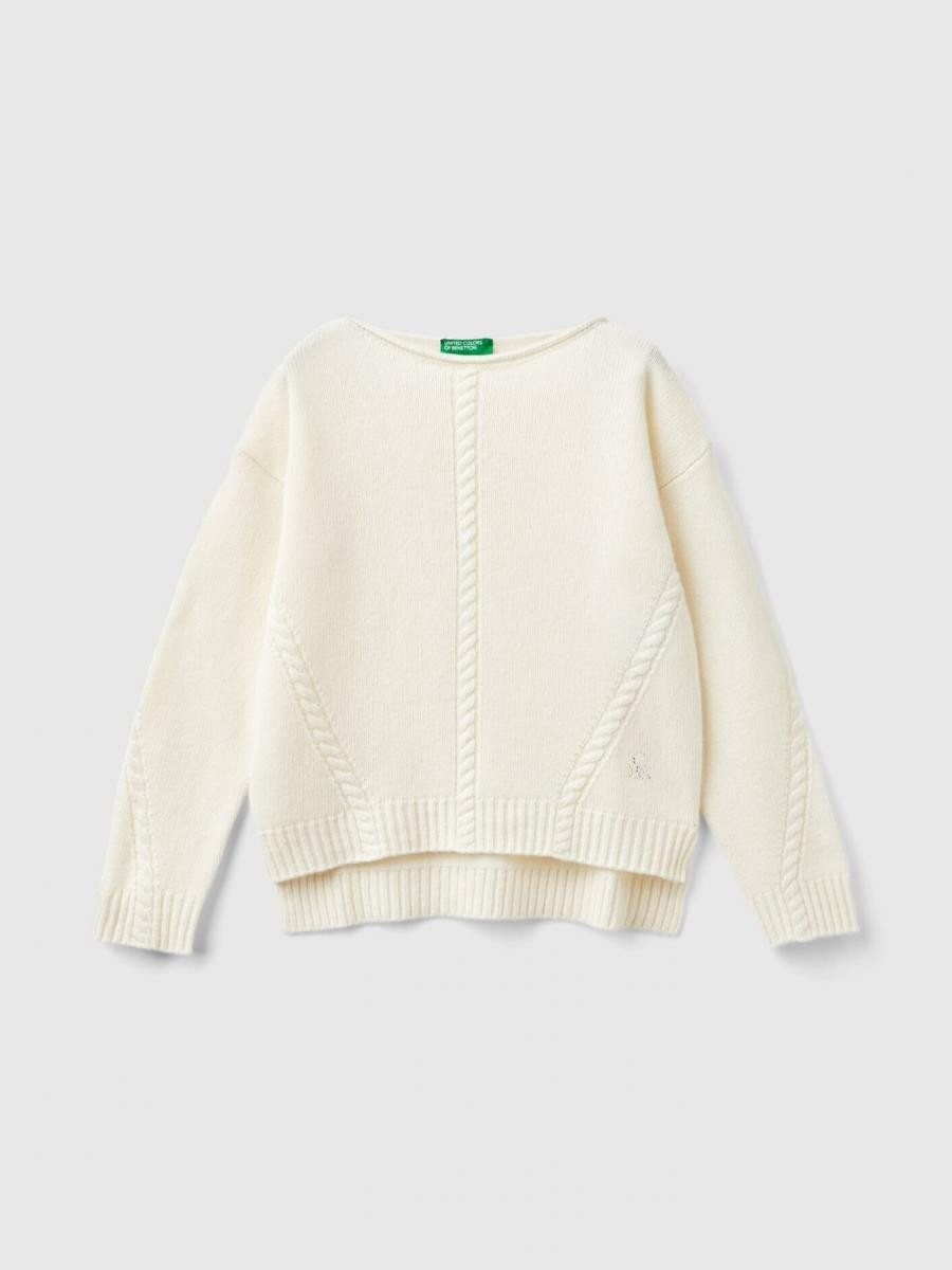 Benetton džemper za devojčicu sa dugim rukavima od mekog vunenog prediva. Okrugli okovratnik sa uvijenim detaljem, neravnim donjim delom koje je duže pozadi, logotipom od štrasa. Prefinjen u svojoj jednostavnosti, sa motivom pletenog kabla na prednjoj strani i na rukavu.