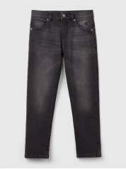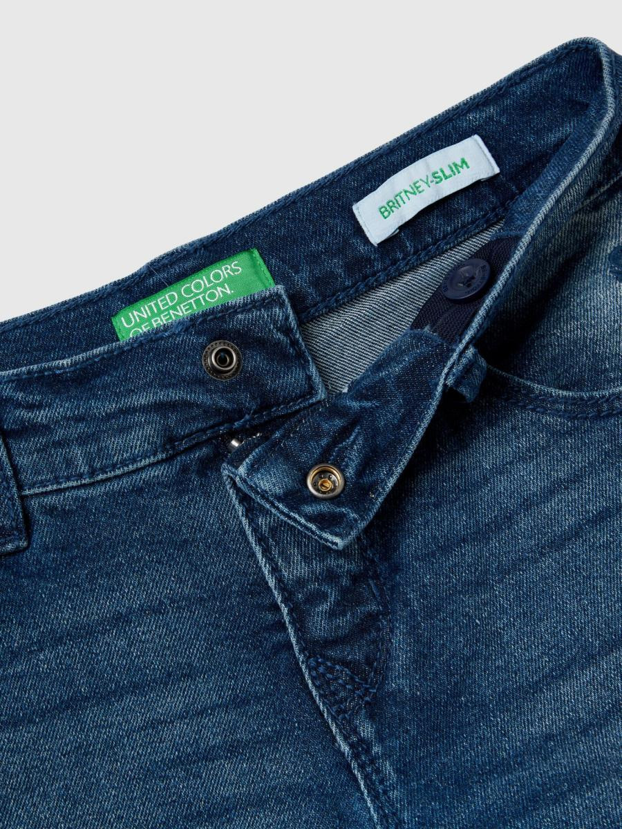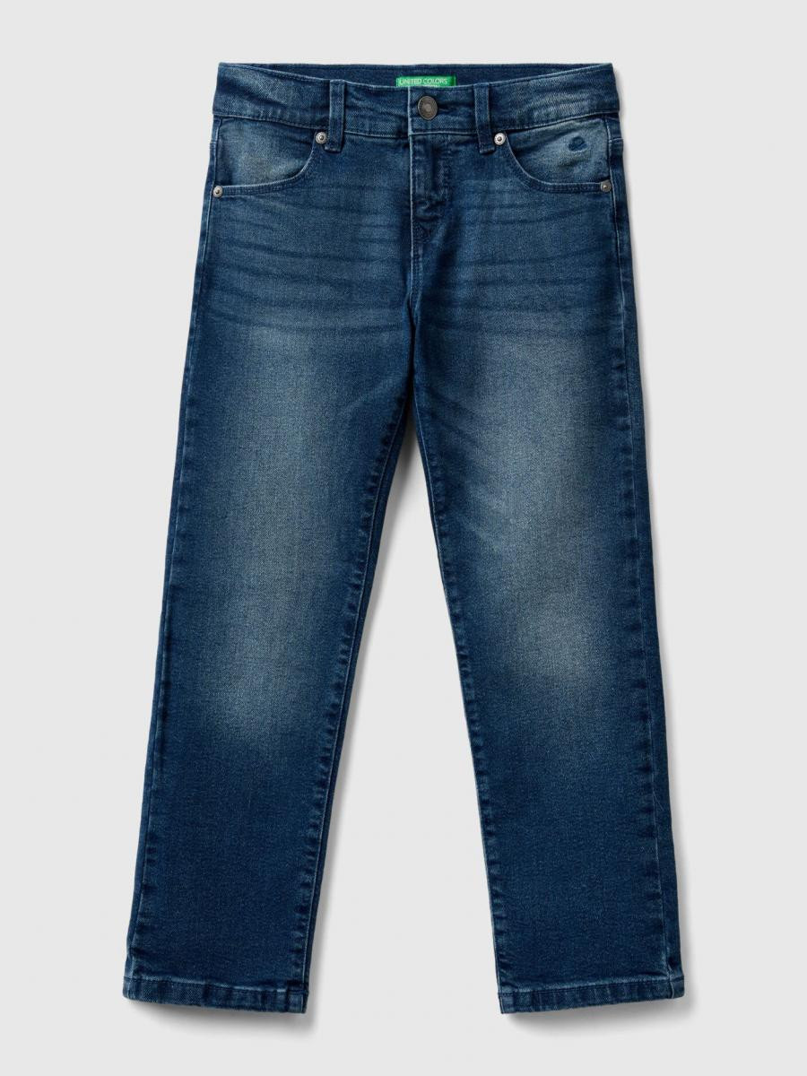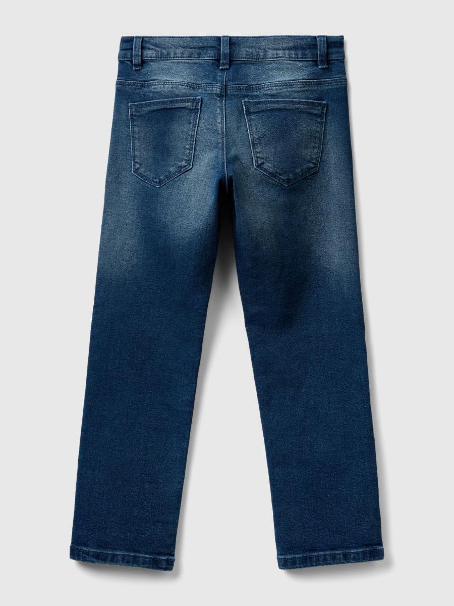Benetton uske pantalone istrošenog izgleda za devojčicu. Dizajn sa pet džepova, patent zatvarač i kopčanje, logo izvezen u gornjem desnom uglu. Napravljen od rastezljivog Eco-Recicle teksasa, koji dolazi od regenerisanih pamučnih vlakana u cilju smanjenja uticaja na životnu sredinu u svim fazama proizvodnje.