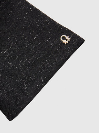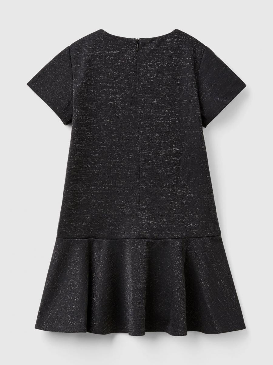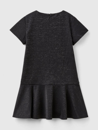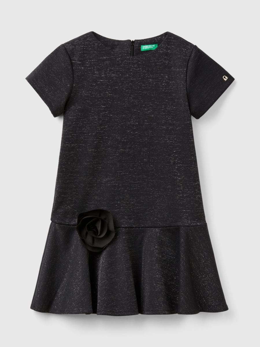 Benetton haljina za devojčicu od meke rastegljive tkanine sa lureksom. Okrugli izrez i kratki rukavi. Šiljati rez sa volanom na dnu i našivenim malim cvetom. Savršeno za nošenje u posebnim prilikama.