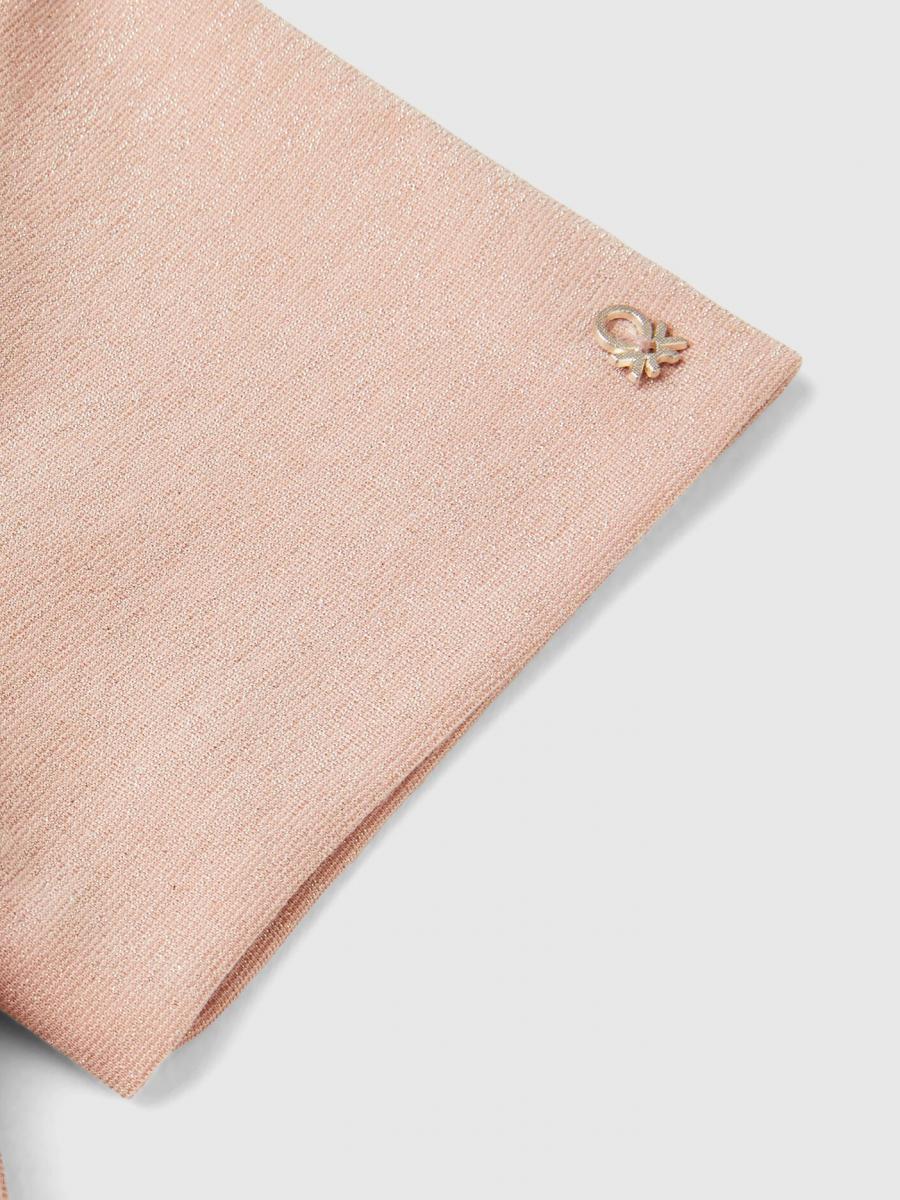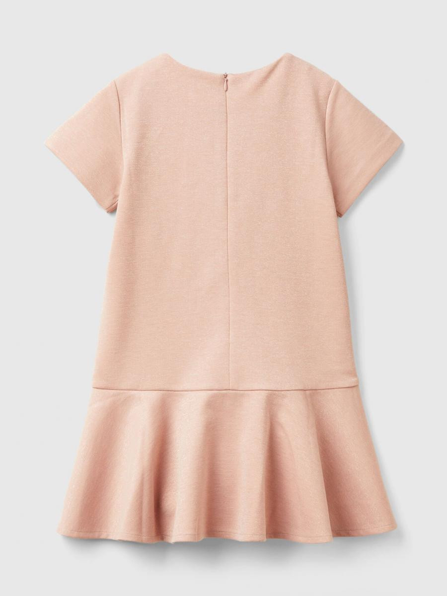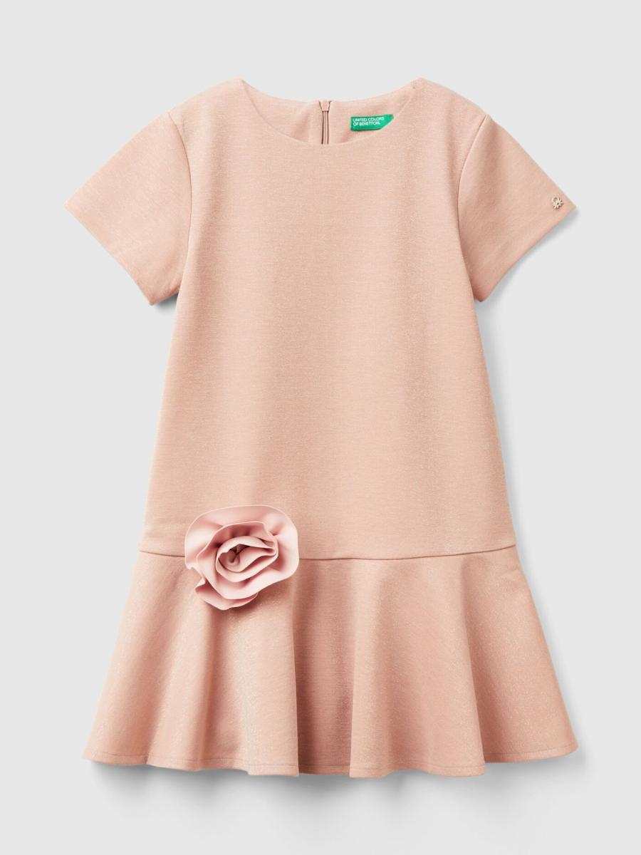 Benetton haljina za devojčicu od meke rastegljive tkanine sa lureksom. Okrugli izrez i kratki rukavi. Šiljati rez sa volanom na dnu i našivenim malim cvetom. Savršeno za nošenje u posebnim prilikama.
