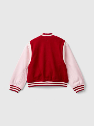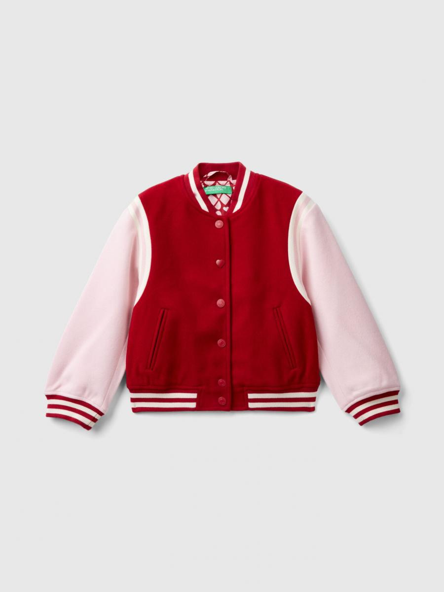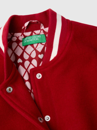 Benetton jakna za devojčicu u stilu bombera podstavljena tkaninom od mešavine vune. Kopčanje sa prednje strane sa dugmadima u obliku srca, umetnuti džepovi na prednjoj strani.