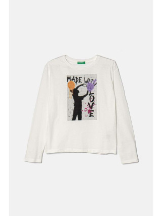 Benetton majica dugih rukava za devojčicu sa okruglim izrezom od čistog organskog pamuka. Meko krojenje, fotografski otisak sa blistavim detaljima na prednjoj strani. Originalno i moderno.