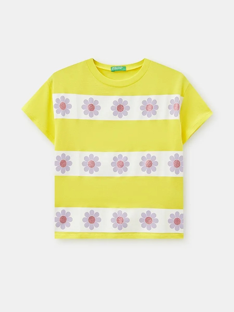 Benetton majica kratkih rukava za devojčicu od čistog organskog pamuka. Okrugli izrez, cvetni print na prednjoj strani sa svetlucavim detaljima i opuštenim krojem. Blistava i ženstvena, za svakodnevno nošenje.