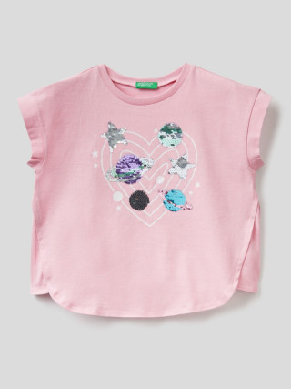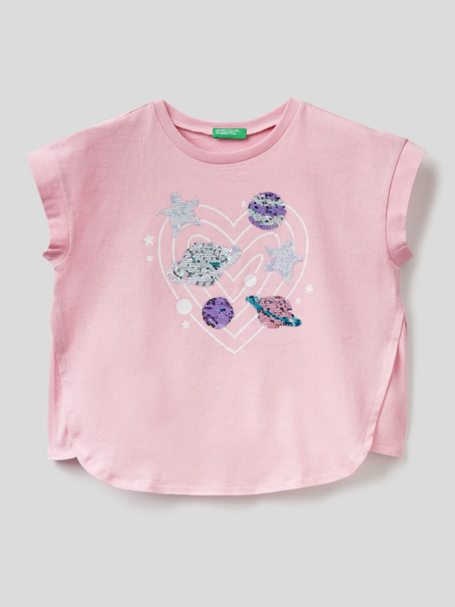 Benetton majica kratkih rukava za devojčicu, 100% organski pamuk. Aplikacija sa reverzibilnim šljokicama na prednjoj strani.