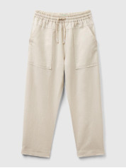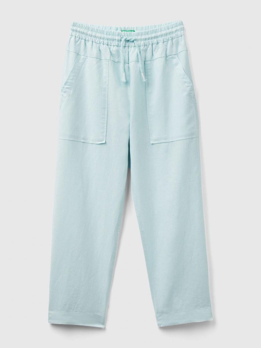 Benetton pantalone za devojčicu sa unutrašnjom elastičnom trakom i vezicom sa resicama u struku. Ažurirani izgled sa prednjim džepovima i ravnim rubom napred i pozadi. Ovaj komad je napravljen od mešavine pamuka i lana: otpornih biljnih vlakana koje se mogu reciklirati i koje troše minimalne prirodne resurse.