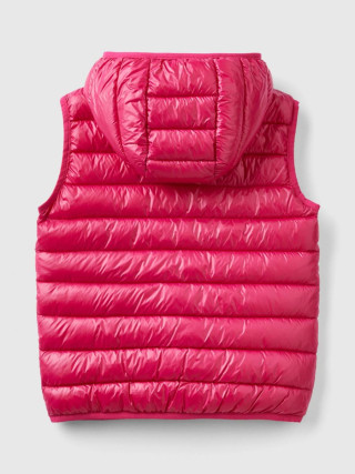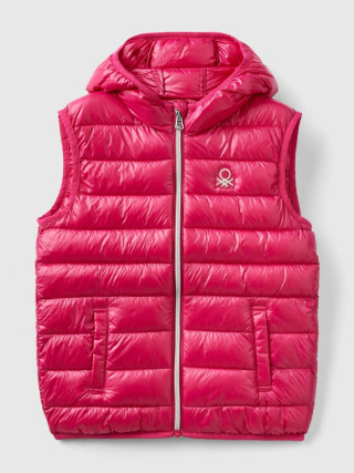 Benetton prsluk za devojčicu od najlona Rain Defender sa klasičnim horizontalnim prošivom, regular fit model. Topla, ali ultra lagana, sa podstavom. Opremljen kapuljačom, patent zatvaračem, džepovi na prednjoj strani, logo na levoj strani grudi.