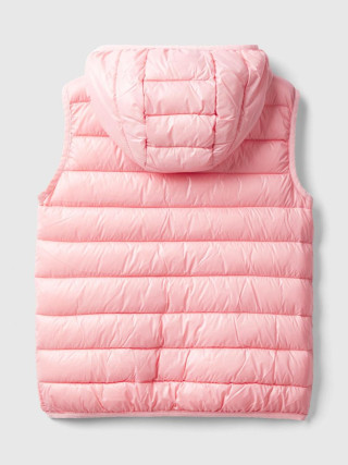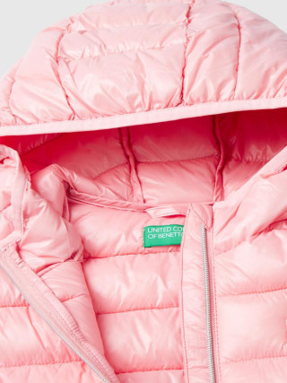 Benetton prsluk za devojčicu od najlona Rain Defender sa klasičnim horizontalnim prošivom, regular fit model. Topla, ali ultra lagana, sa podstavom. Opremljen kapuljačom, patent zatvaračem, džepovi na prednjoj strani, logo na levoj strani grudi.