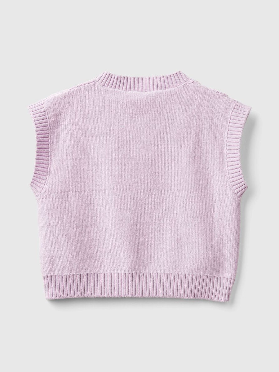 Benetton prsluk za devojcicu od mekog prediva od mešavine pamuka i vune sa prorezima na prednjem rubu. V-izrez, pleteno sa igrom tacaka i motivom srca.