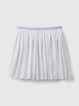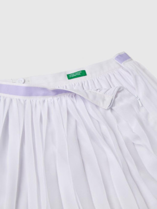 Benetton plisirana suknja za devojčicu od krep tkanine sa efektom nabora i sa unutrašnjom podstavom. Kontrastni struk sa unutrašnjim elastičnim, nevidljivim patentnim zatvaračem na jednoj strani. Šik i ženstvena, idealan za ceremonije i posebne prilike.
