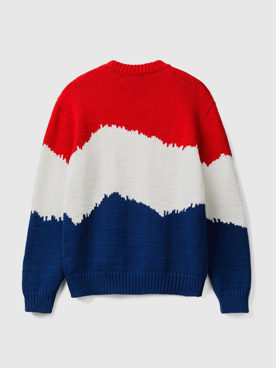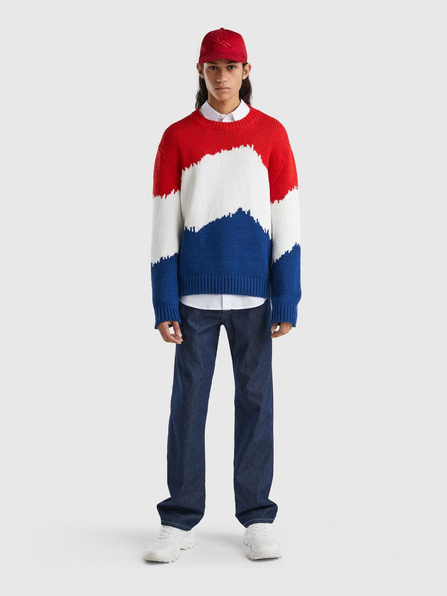 Benetton muški džemper dugih rukava sa okruglim izrezom od mekog čistog toplog pamučnog prediva. Specijalni dizajn sa pletenim umetkom u tri boje.