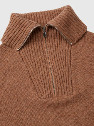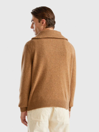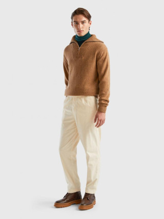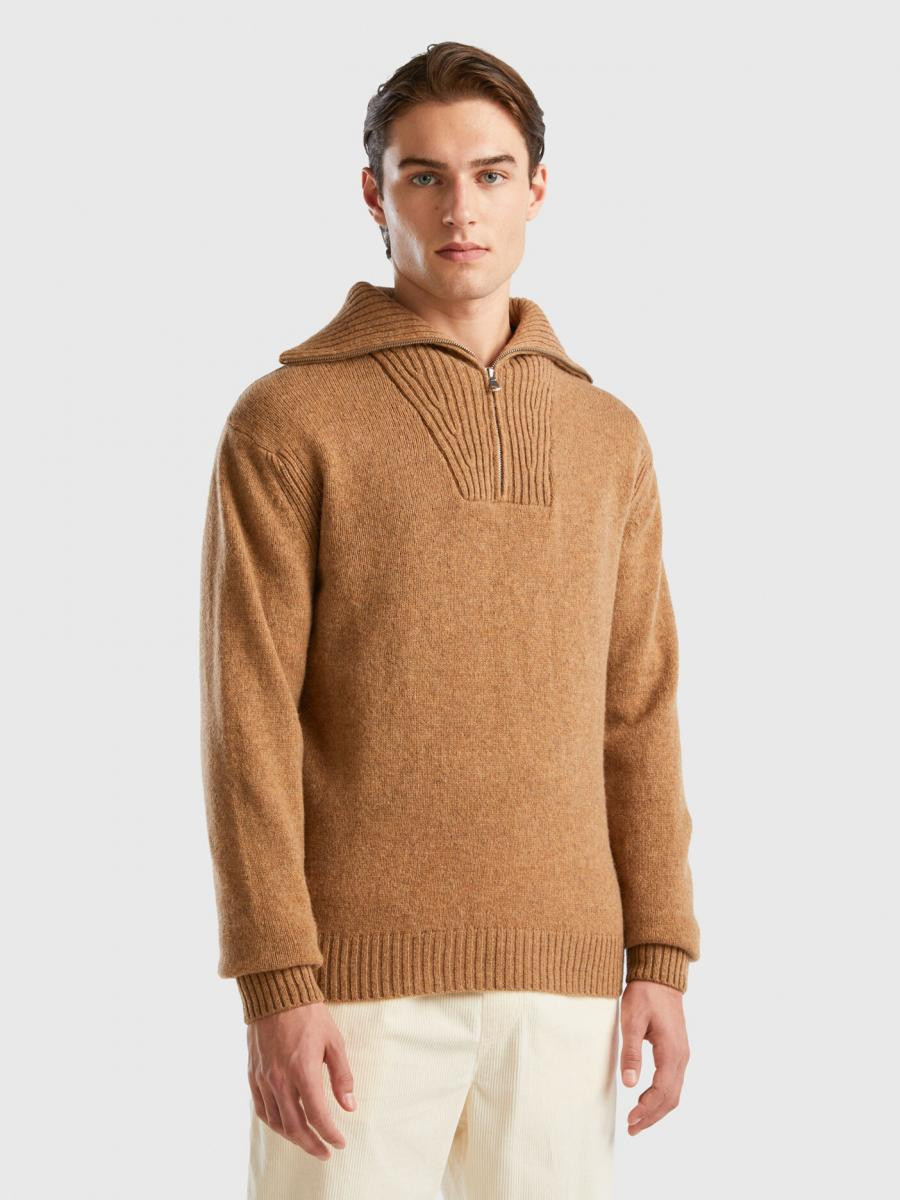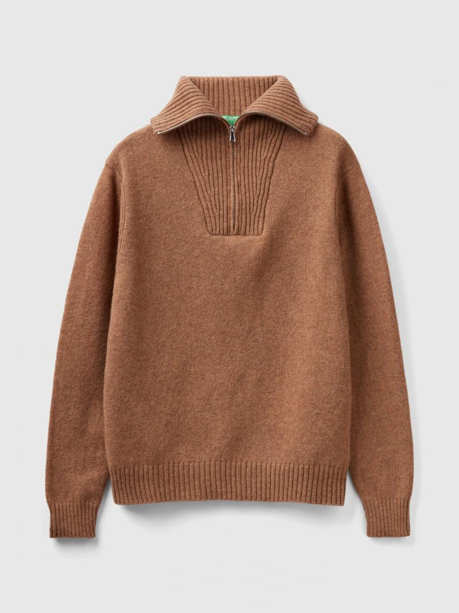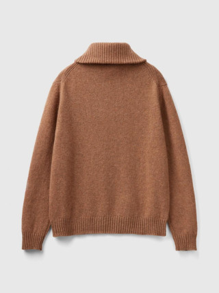 Benetton muški topli džemper sa visokim okovratnikom, dugim rukavima i delimičnim otvaranjem na patent zatvarač. Napravljen od italijanskog prediva od 100% šetlandske vune, bogata, ali iznenađujuc´e mekana i odlikuje se velikom izdržljivošću. Prisustvo logotipa Voolmark garantuje visok kvalitet odevnih predmeta kroz primenu i praćenje specifičnih standarda u proizvodnji vune, od uzgoja do finalnog proizvoda.