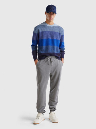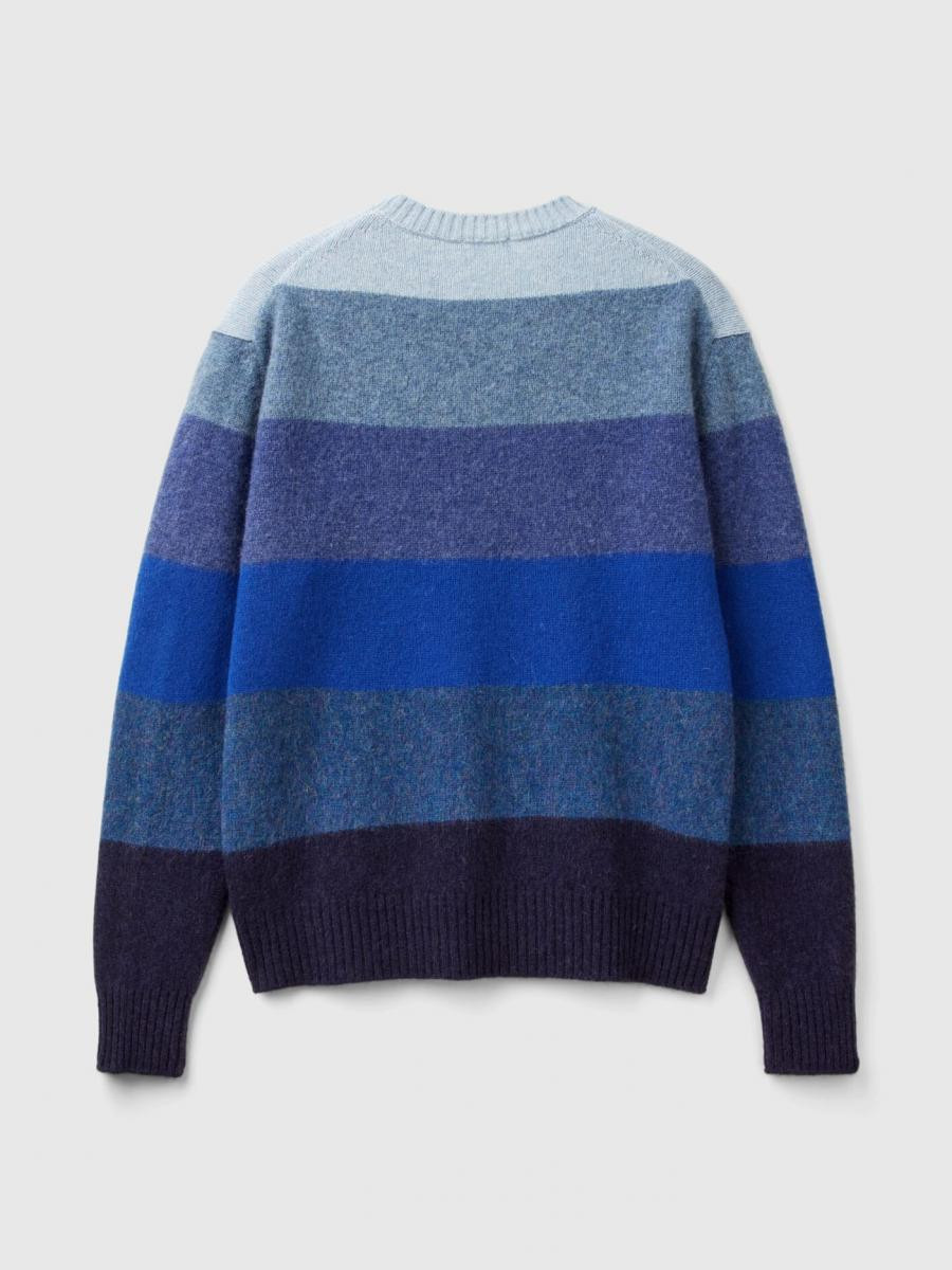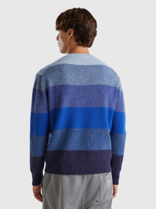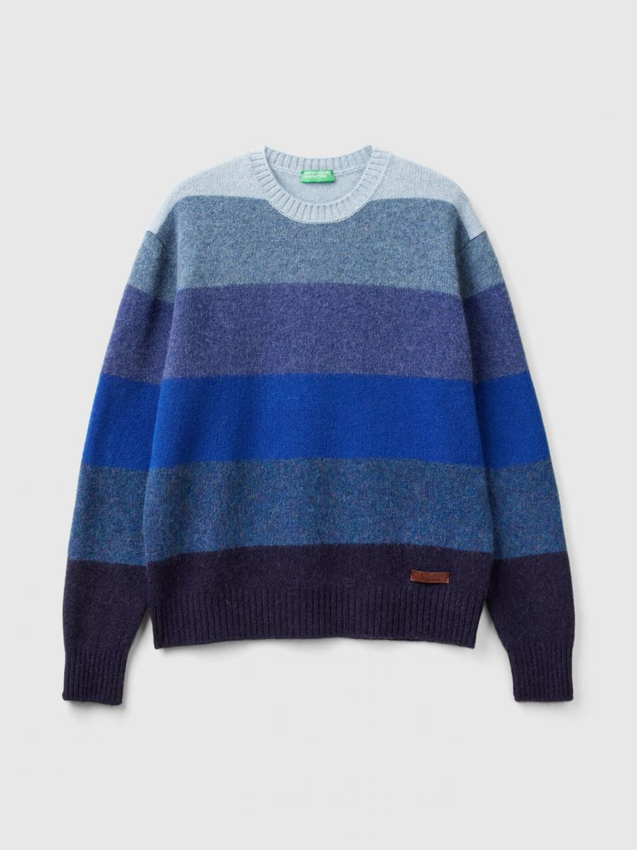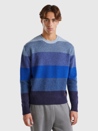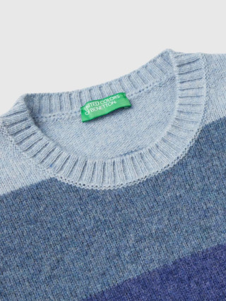 Benetton muški džemper sa okruglim izrezom dugih rukava opuštenog kroja sa višebojnim prugastim dezenom. Izrađen od italijanskog prediva od 100% šetlandske vune, bogata, ali iznenađujuće mekana i odlikuje se velikom izdržljivošću. Prisustvo logotipa Voolmark garantuje visok kvalitet odevnih predmeta primenom i praćenjem specifičnih standarda u proizvodnji vune, od uzgoja do finalnog proizvoda.