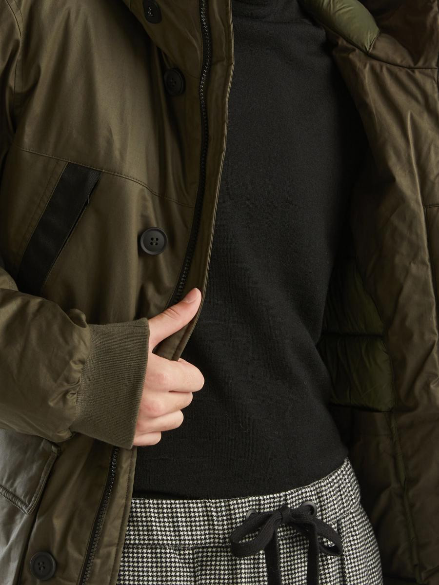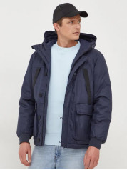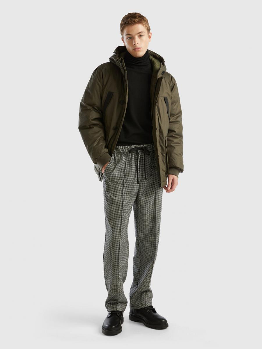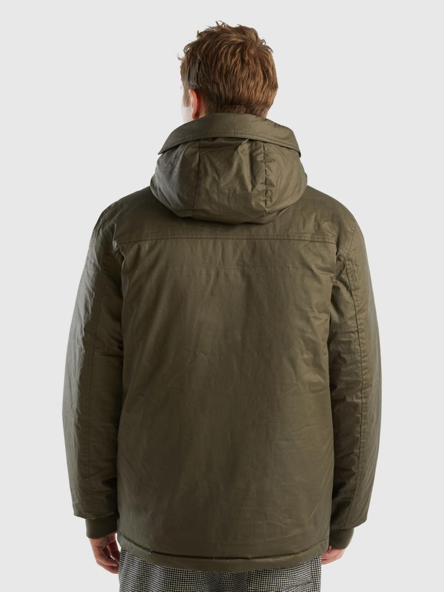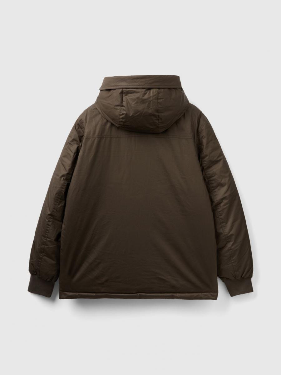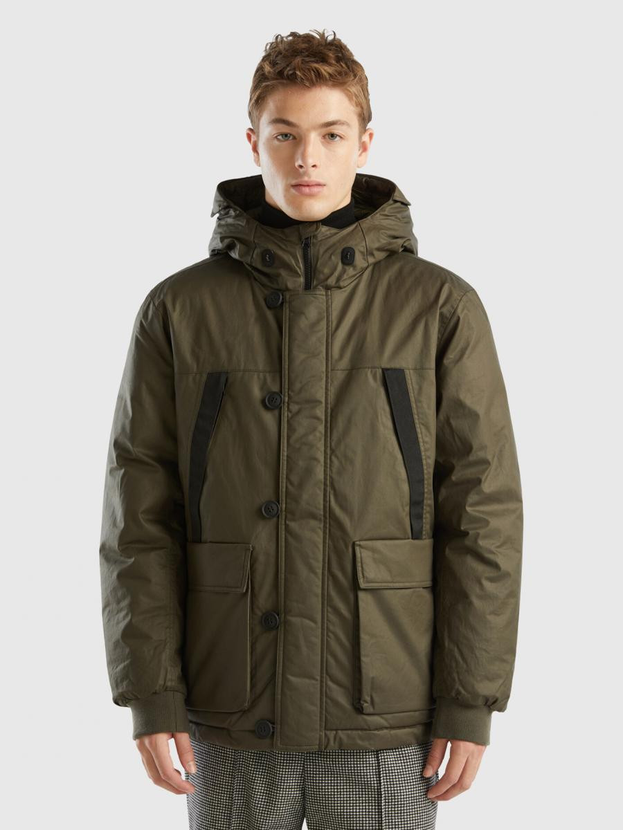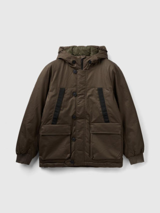 Benetton muška kratka podstavljena jakna u stilu parke od čistog pamuka. Opremljena je podesivom kapuljačom sa vezicom i držačima gajtana, prednjim otvaranjem do brade sa patent zatvaračem, dugmićima i kopčama. Dijagonalni džepovi na grudima sa rajsferšlusom i trakom, džepovi sa preklopom sa dugmićima na prednjoj strani.