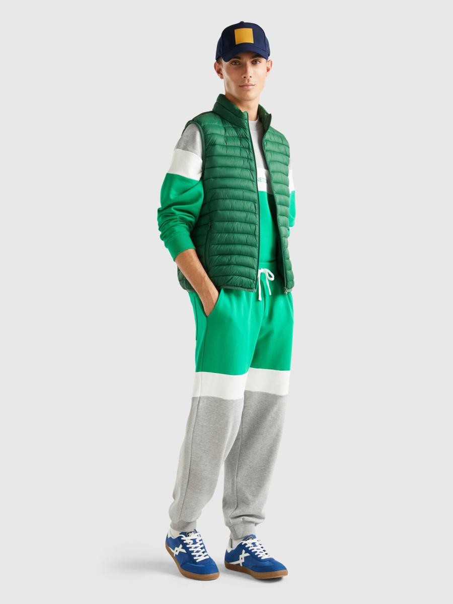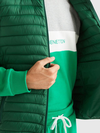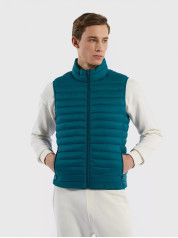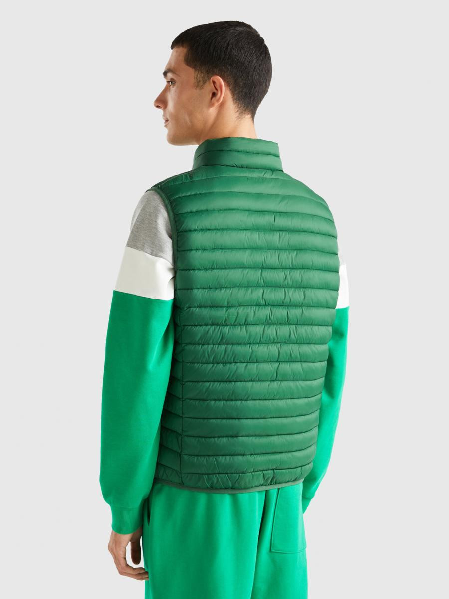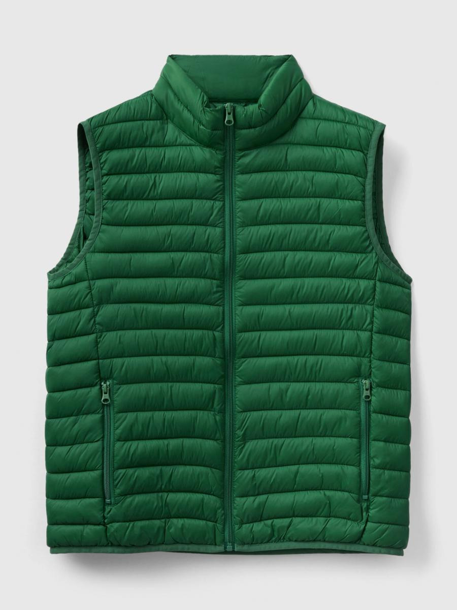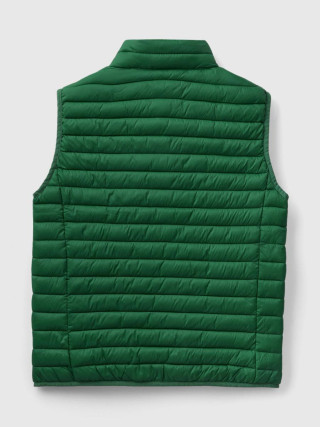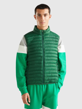 Benetton muški prsluk od najlona Rain Defender dobrog kroja. Stojeci vrat, kopcanje sa patent zatvaracem i prednji džepovi sa patent zatvaracem. Topla, ali lagana podloga od reciklirane vate, proizvedena od PET plasticnih boca. Savršeno za nošenje kao dodatni sloj.